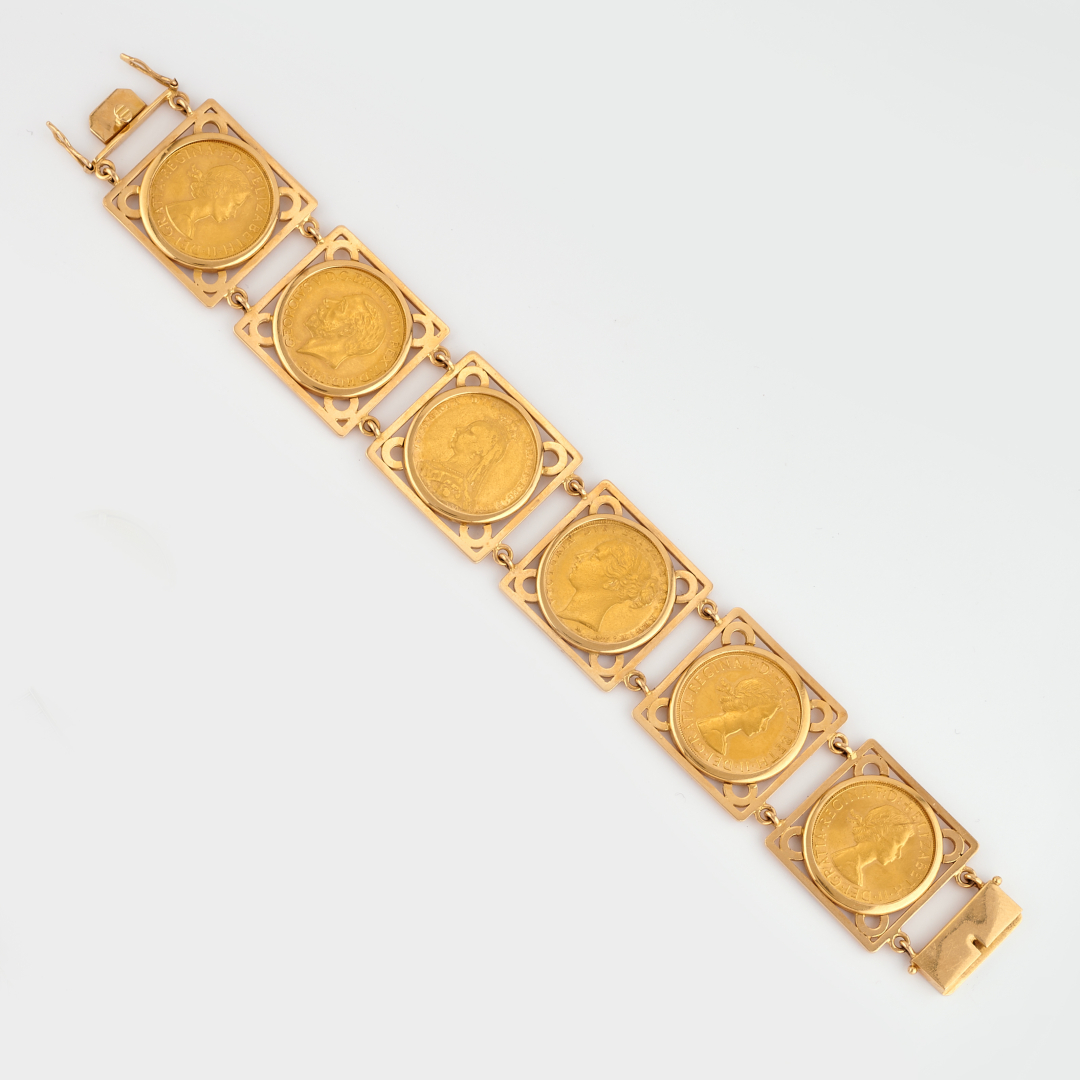 in yellow gold, designed as six square settings holding gold British pounds.