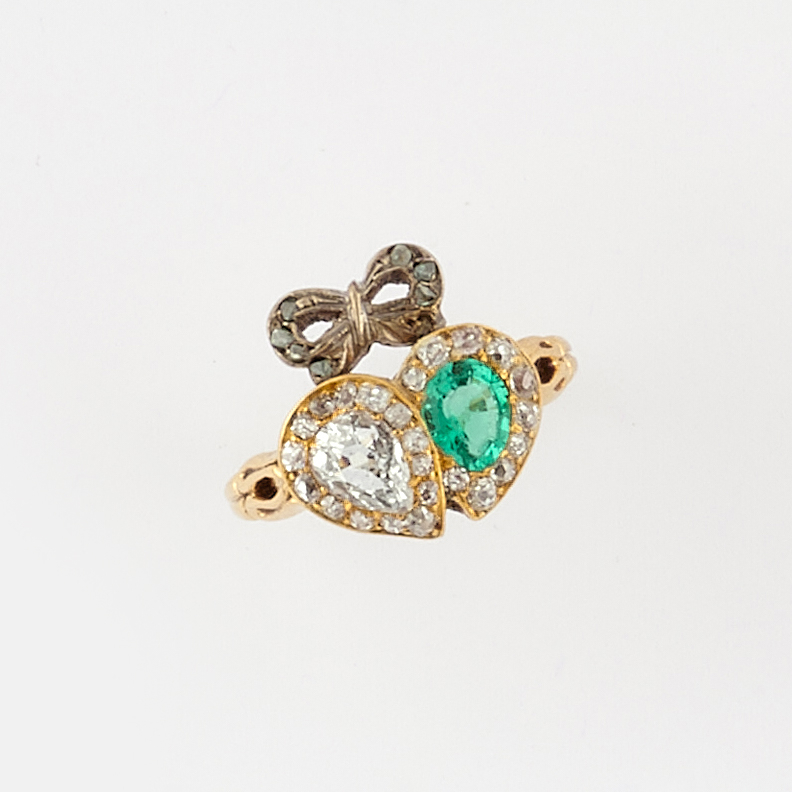 in yellow gold set with a pear-cut diamond flanked by a pear-cut green stone framed by Old Mine-cut diamonds weighing approx. 0.80 ct all together.