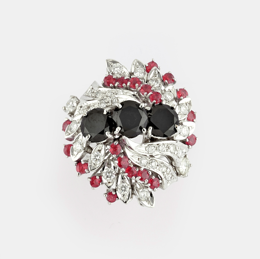 DIAMOND, RUBY AND BLACK STONE RING