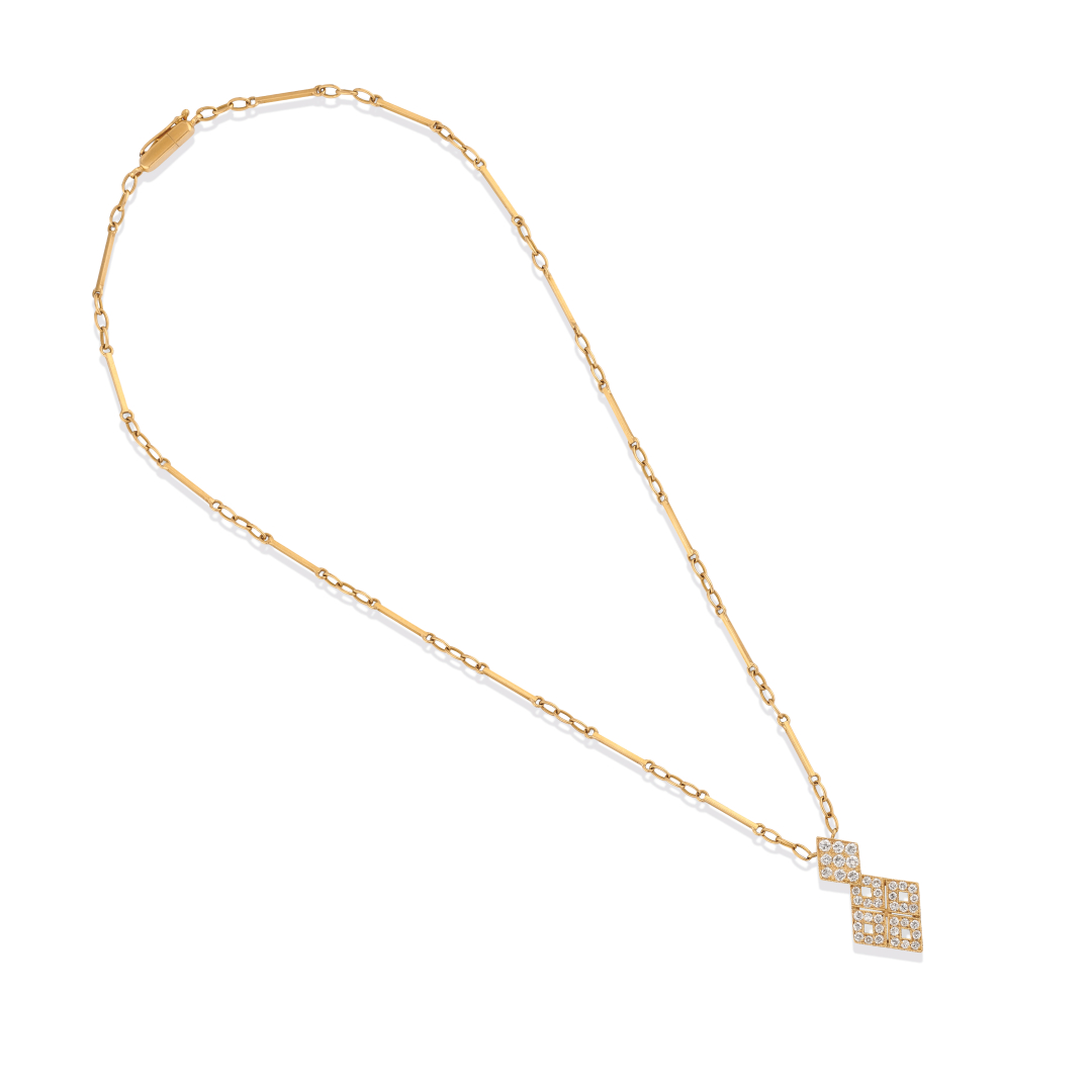 designed as a yellow gold chain with rigid elements alternated with three rings and a pendant of double-rhomboidal shape highlighted with round brilliant-cut diamonds weighing approx. 1.20 ct.