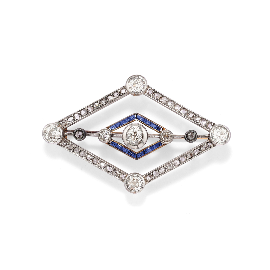 in white and yellow gold, rhomboid shape, with Old Mine-cut and rose-cut diamonds, weighing approx. 1.50 ct and sapphires. Europe, early 1900s.