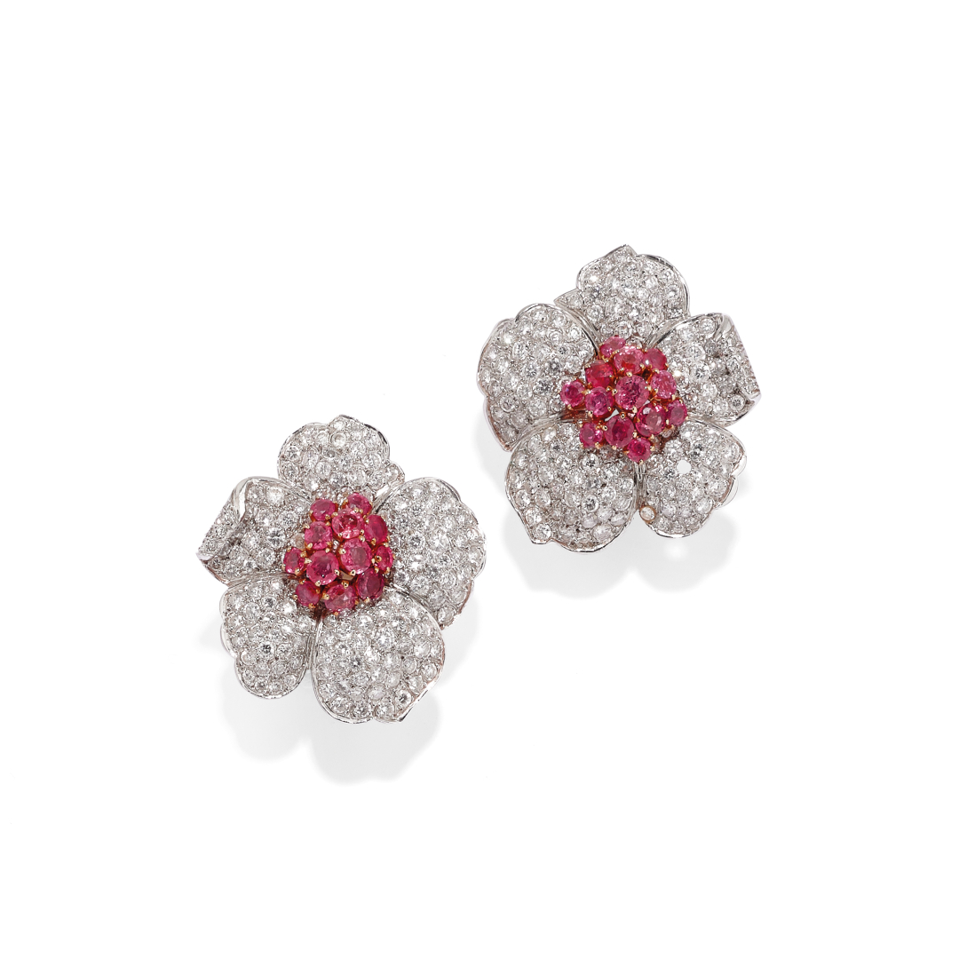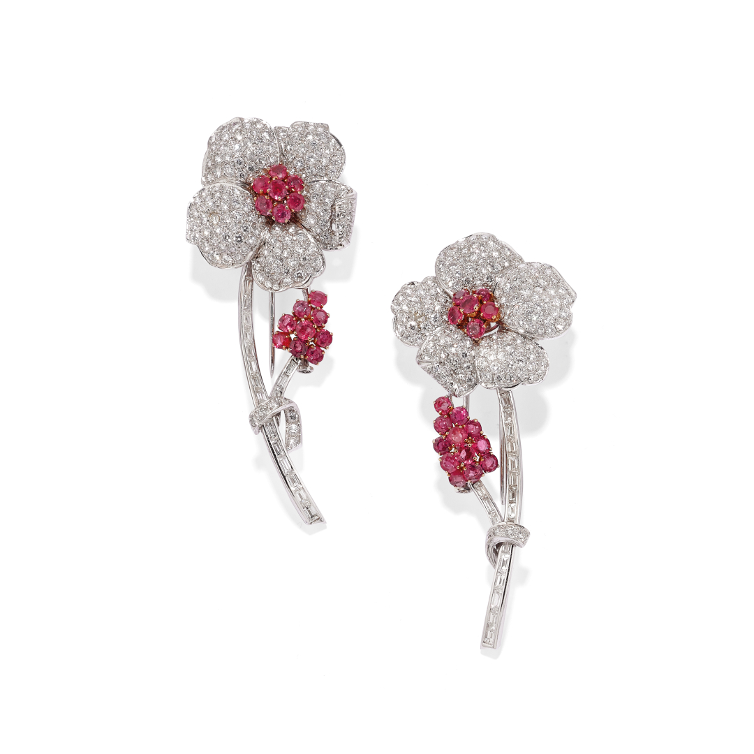 in white and yellow gold, including two long flower brooches with clip fittings pavé-set with diamond baguettes and circular-cut rubies, a pair of ear clips pavé-set with circular-cut diamonds and rubies. Total estimated weight of diamonds 6.00 ct; total estimated weight of rubies 5.00 ct. Three diamonds deficient. In Peppino Capuano - Roma original fitted case.