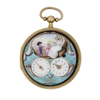 Polychrome enameled dial depicting a daily family scene within oval frame, off-centered dials for the hours and calendar with Breguet numerals.