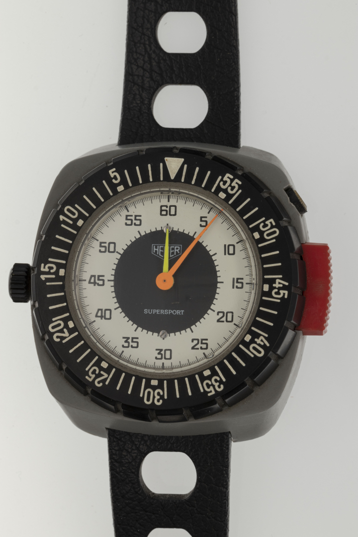 1/5 second stopwatch with minute register and rotating bezel. Acrylic case, Tropic Sport strap and steel buckle.