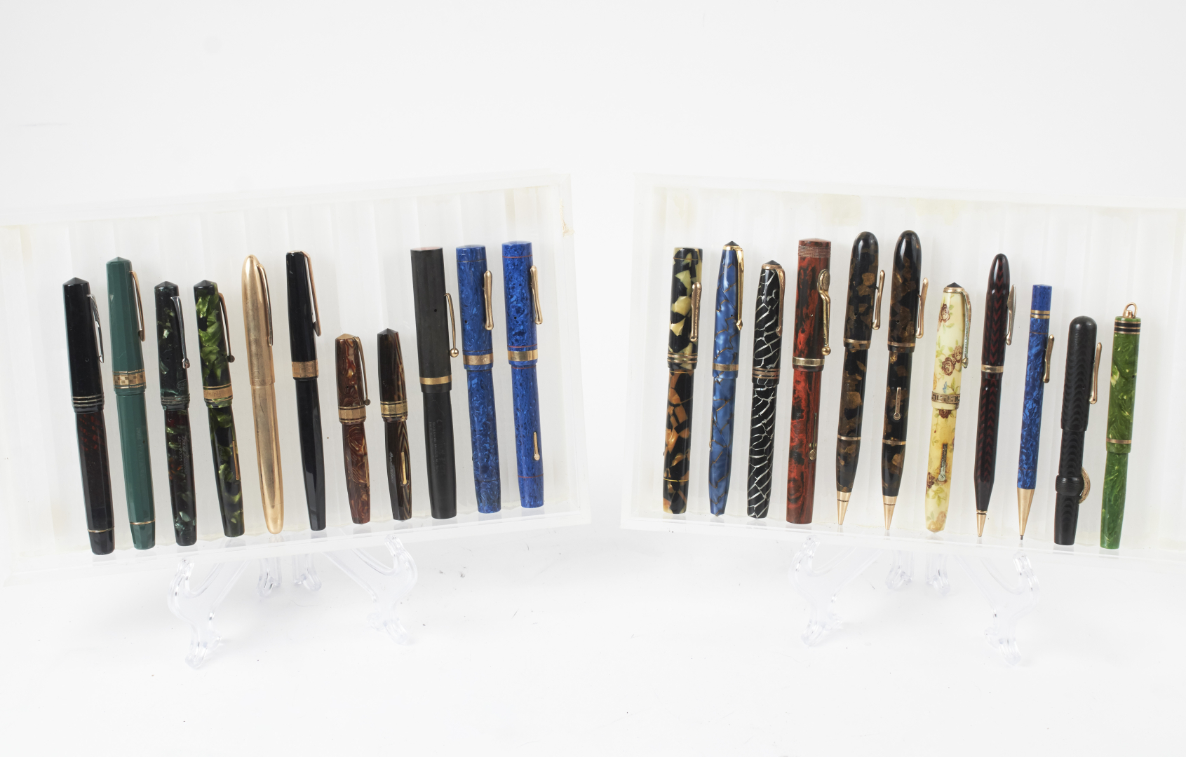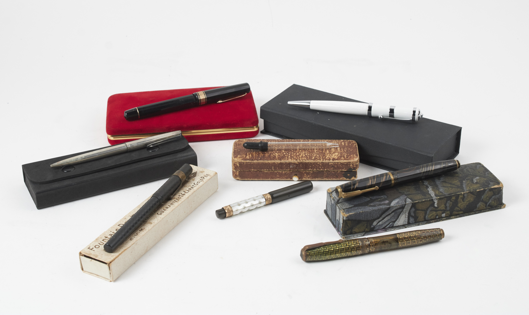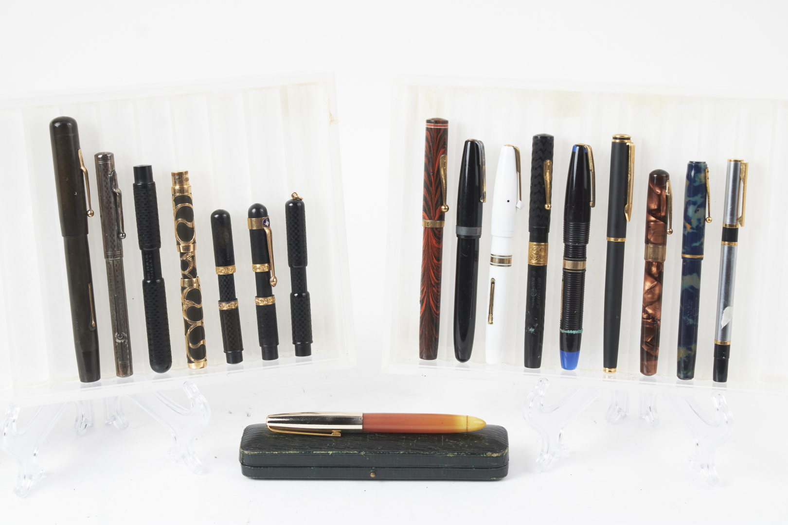 Mostly fountain pens, from various brands, materials, models, and periods. Notable examples include Waterman, Omas, Conklin, Conway, and Sheaffer, along with at least one or more Aurora, Parker, Pelikan, Montblanc, and other 20th-century makers.
