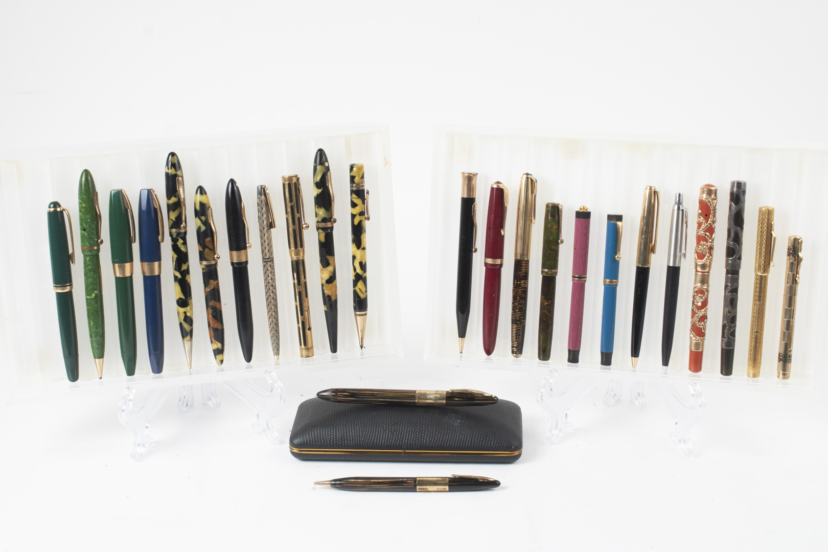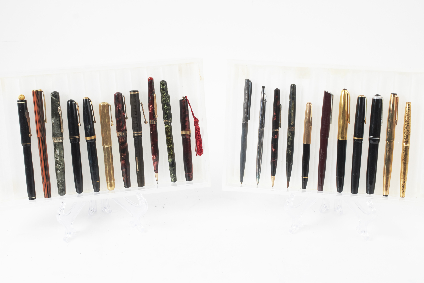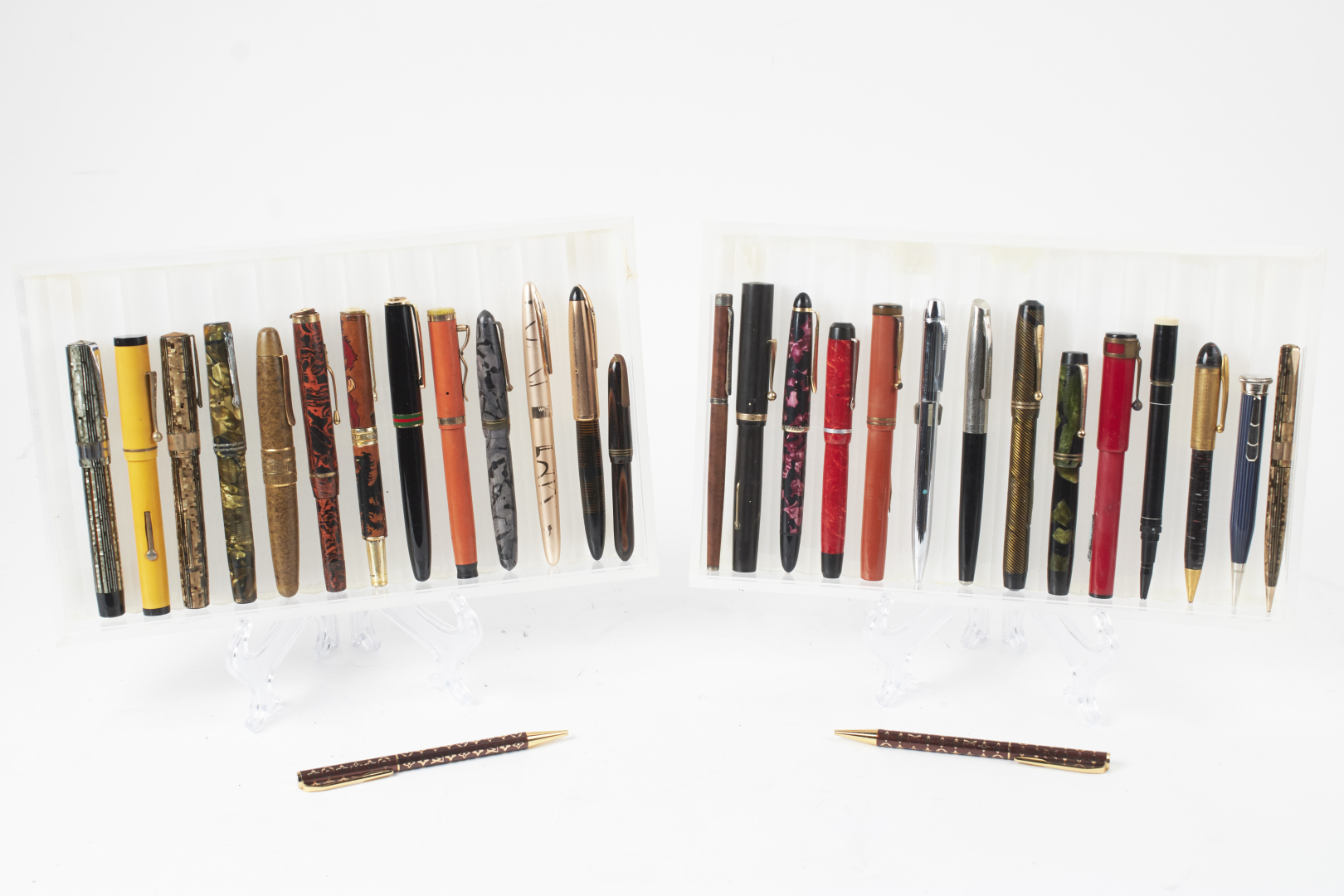 Mostly fountain pens, from various brands, materials, models, and periods. Notable examples include Waterman, Omas, Conklin, Conway, and Sheaffer, along with at least one or more Aurora, Parker, Pelikan, Montblanc, and other 20th-century makers.
