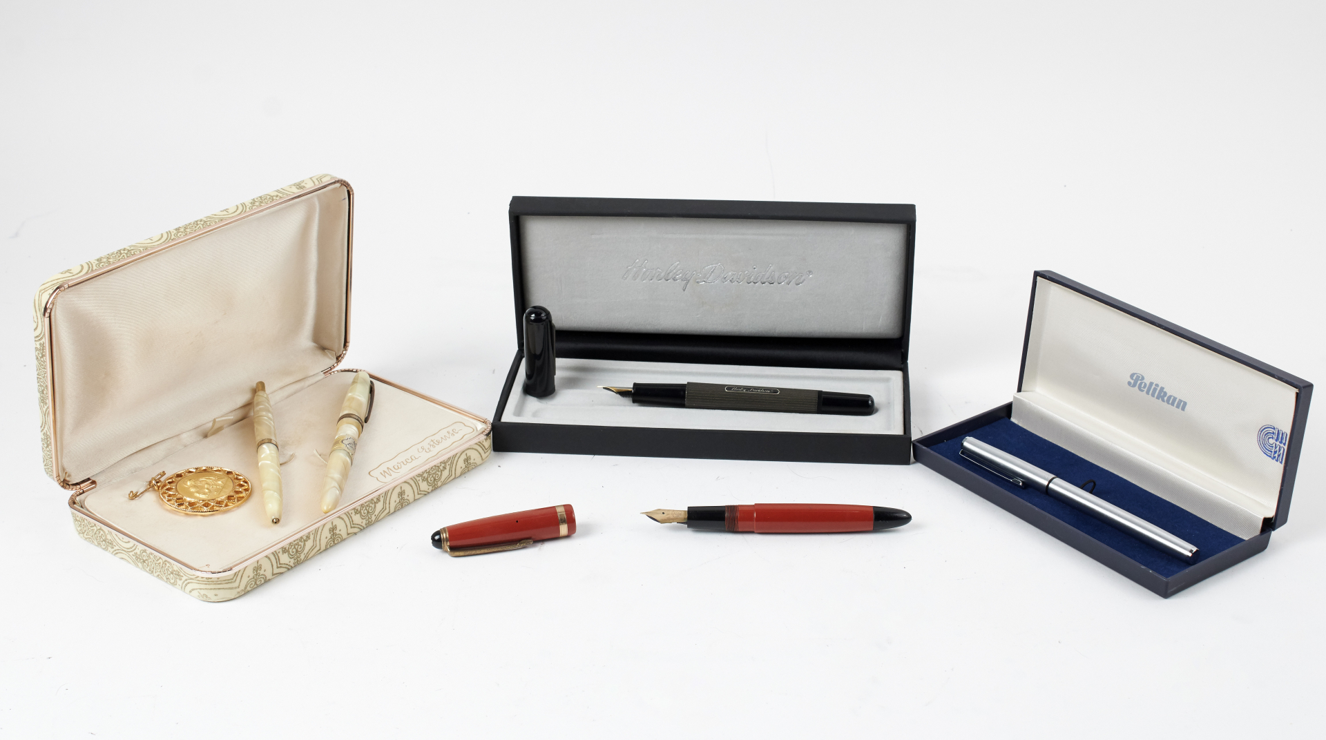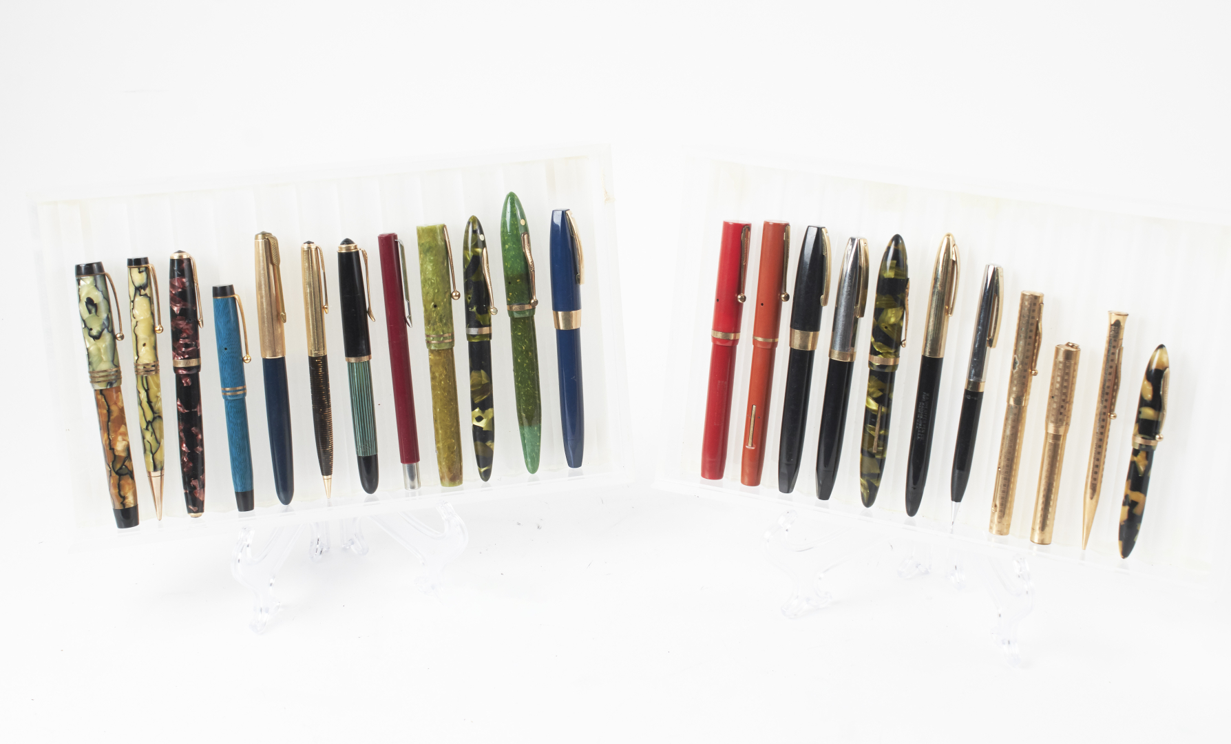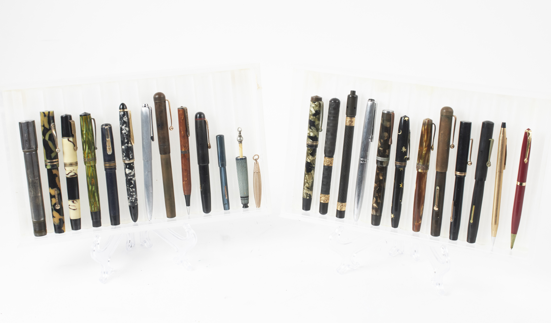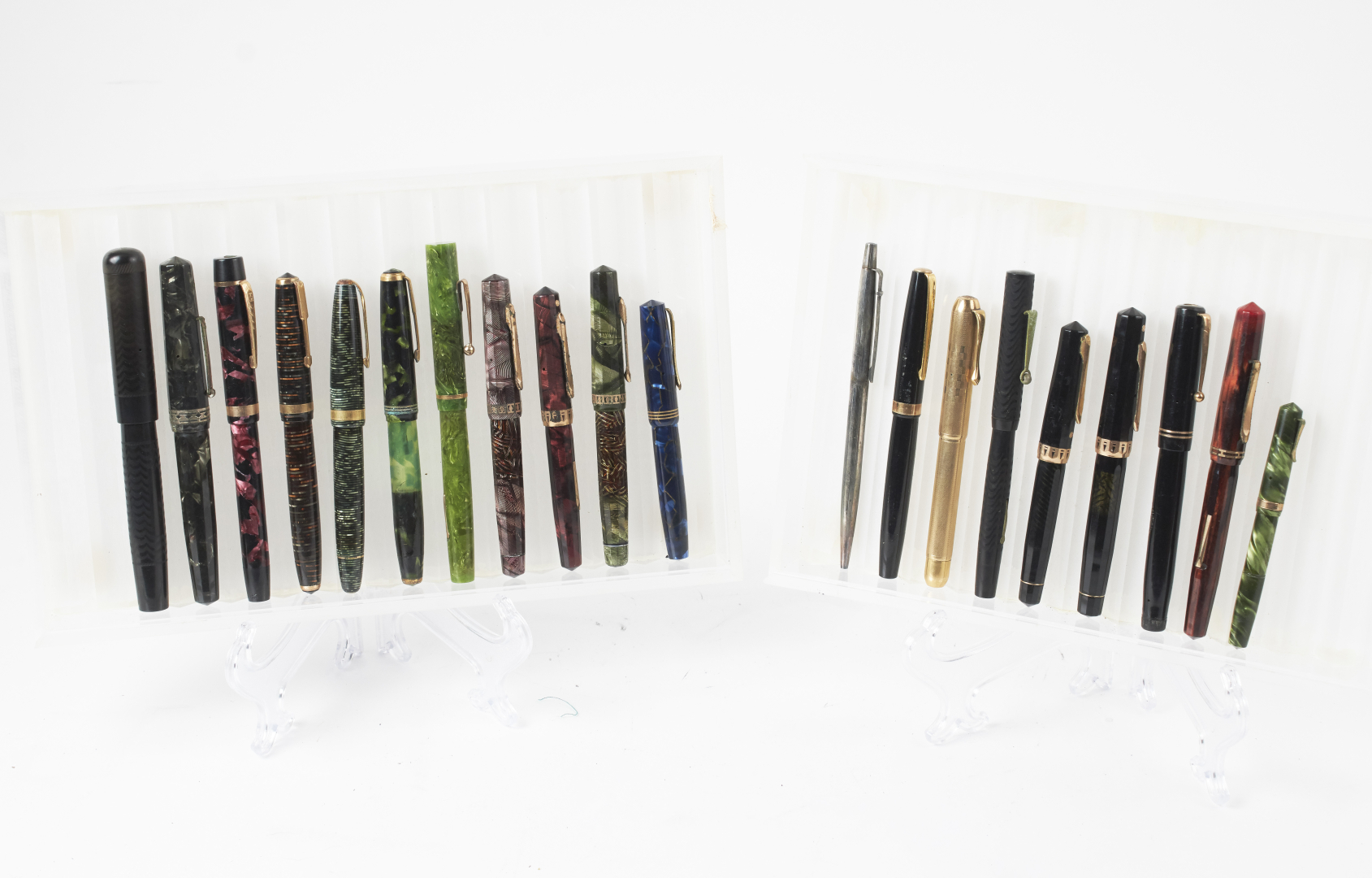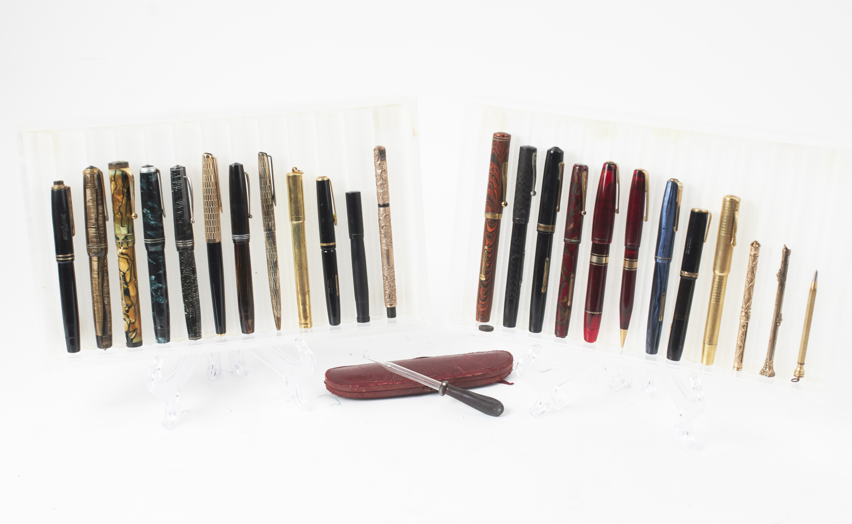 Mostly fountain pens, from various brands, materials, models, and periods. Notable examples include Waterman, Omas, Conklin, Conway, and Sheaffer, along with at least one or more Aurora, Parker, Pelikan, Montblanc, and other 20th-century makers.