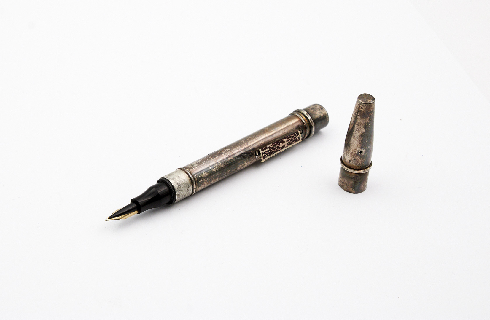 Gold nib, F size, eyedropper filling, sterling silver body.