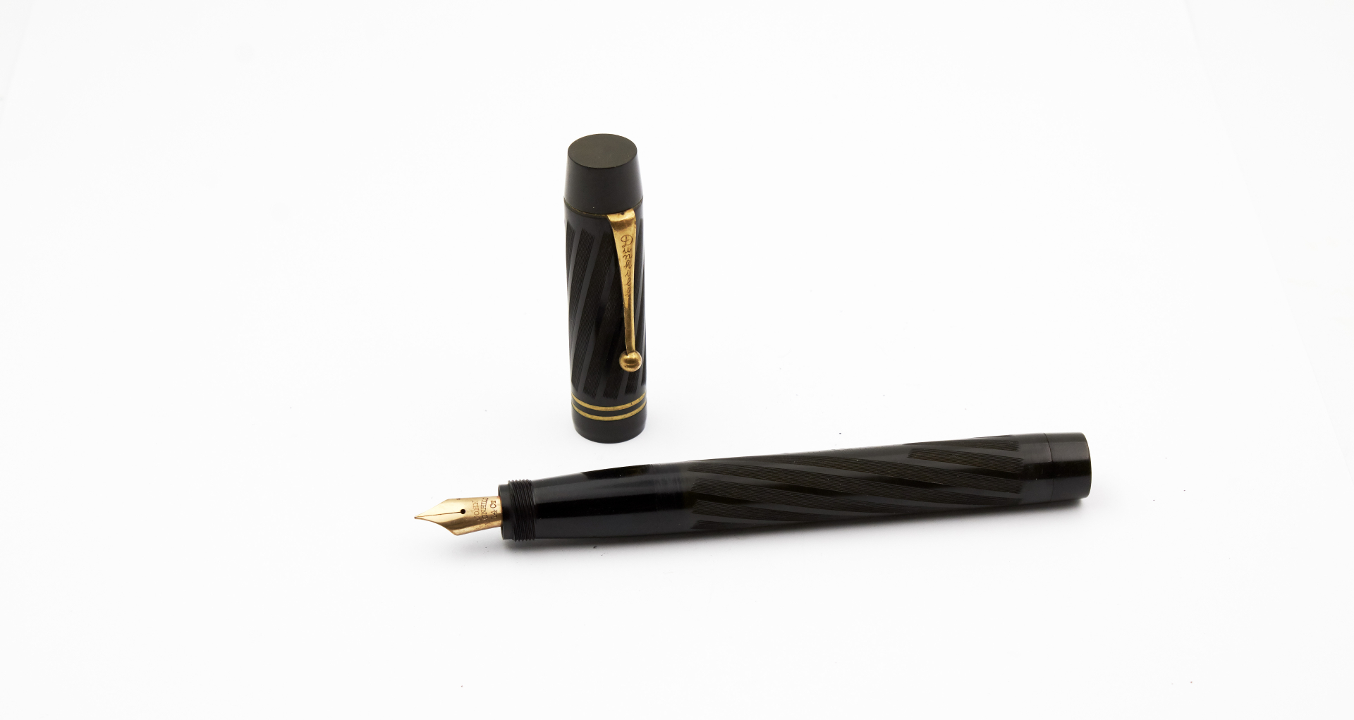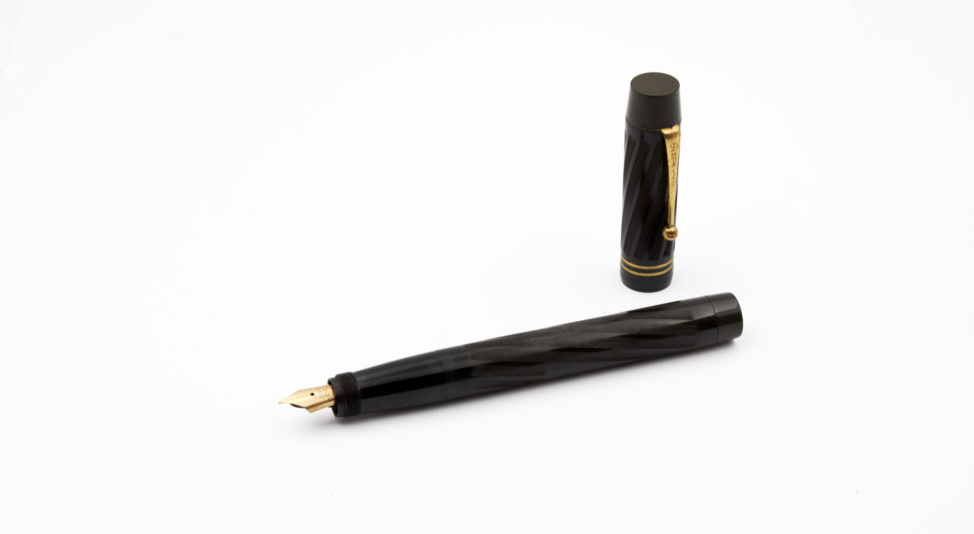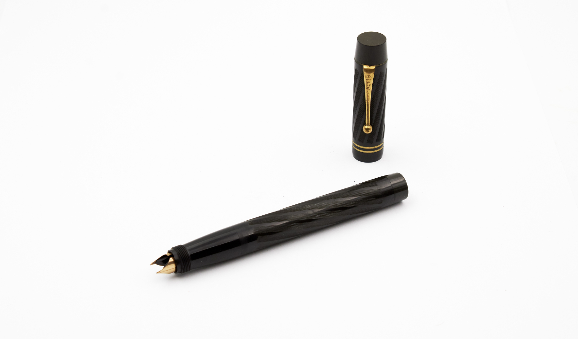 Signed 14K gold nibs, presumably M size, dual retractable nib system, Patent n. 397736, chased black ebonite.