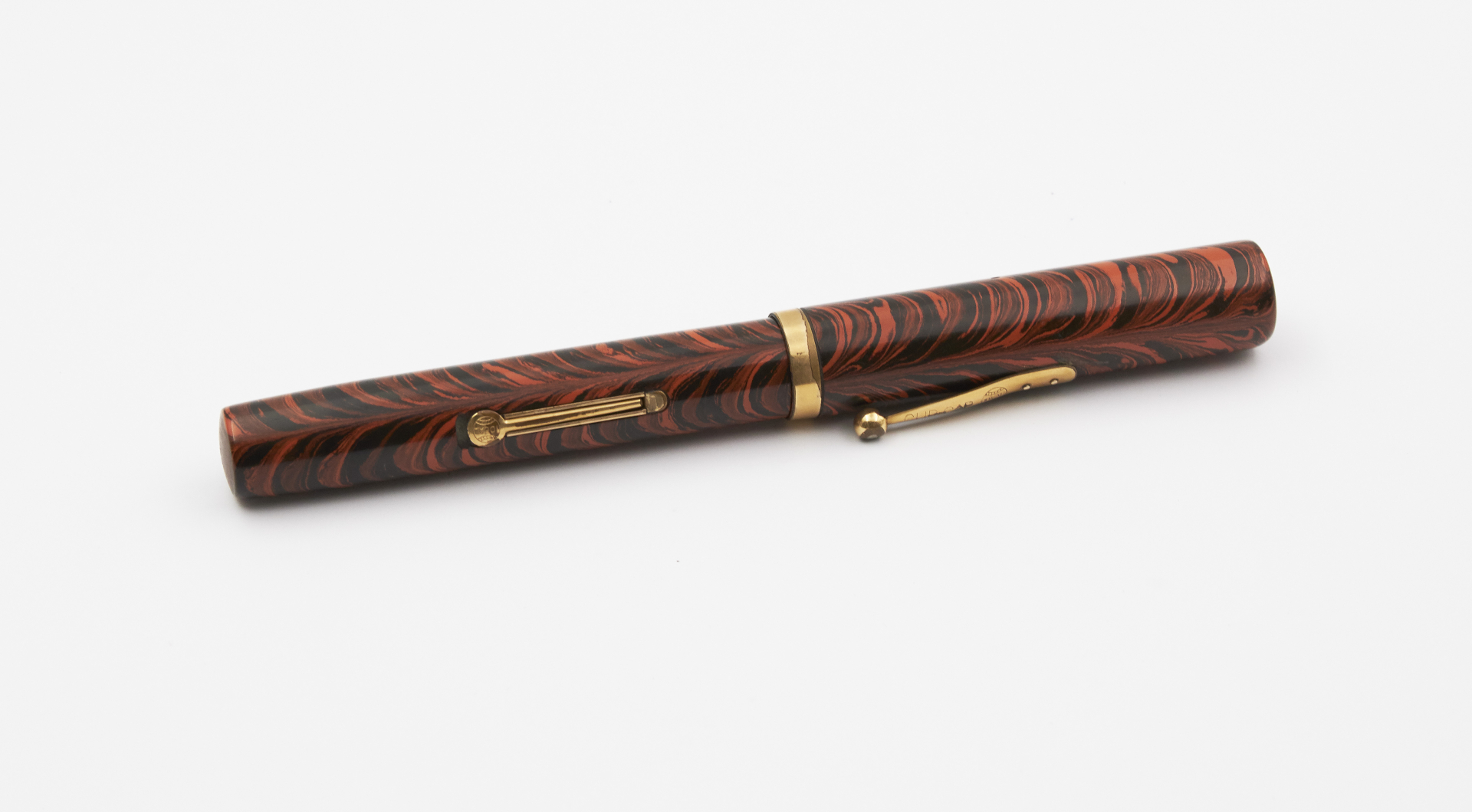 Signed gold nib, n. 8, presumably F size, lever filling, mottled red ebonite, n. 58 engraved on the end cap.