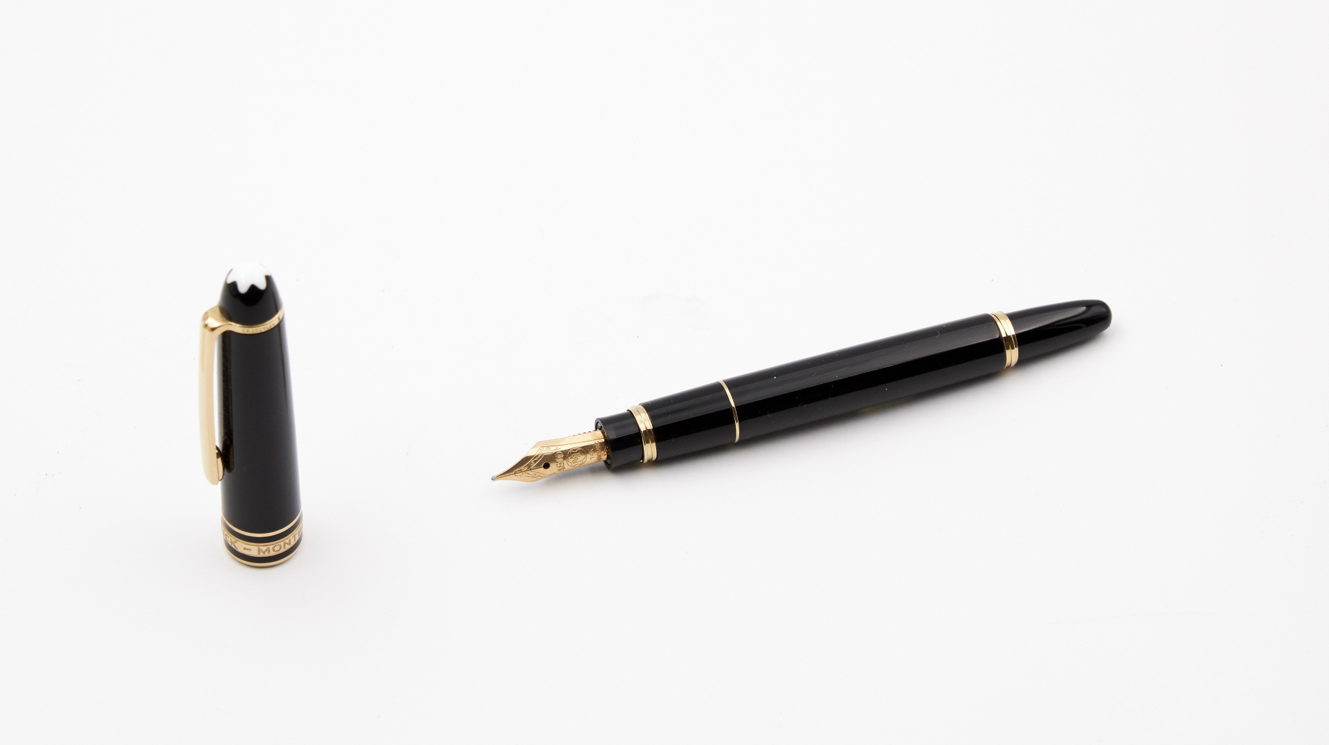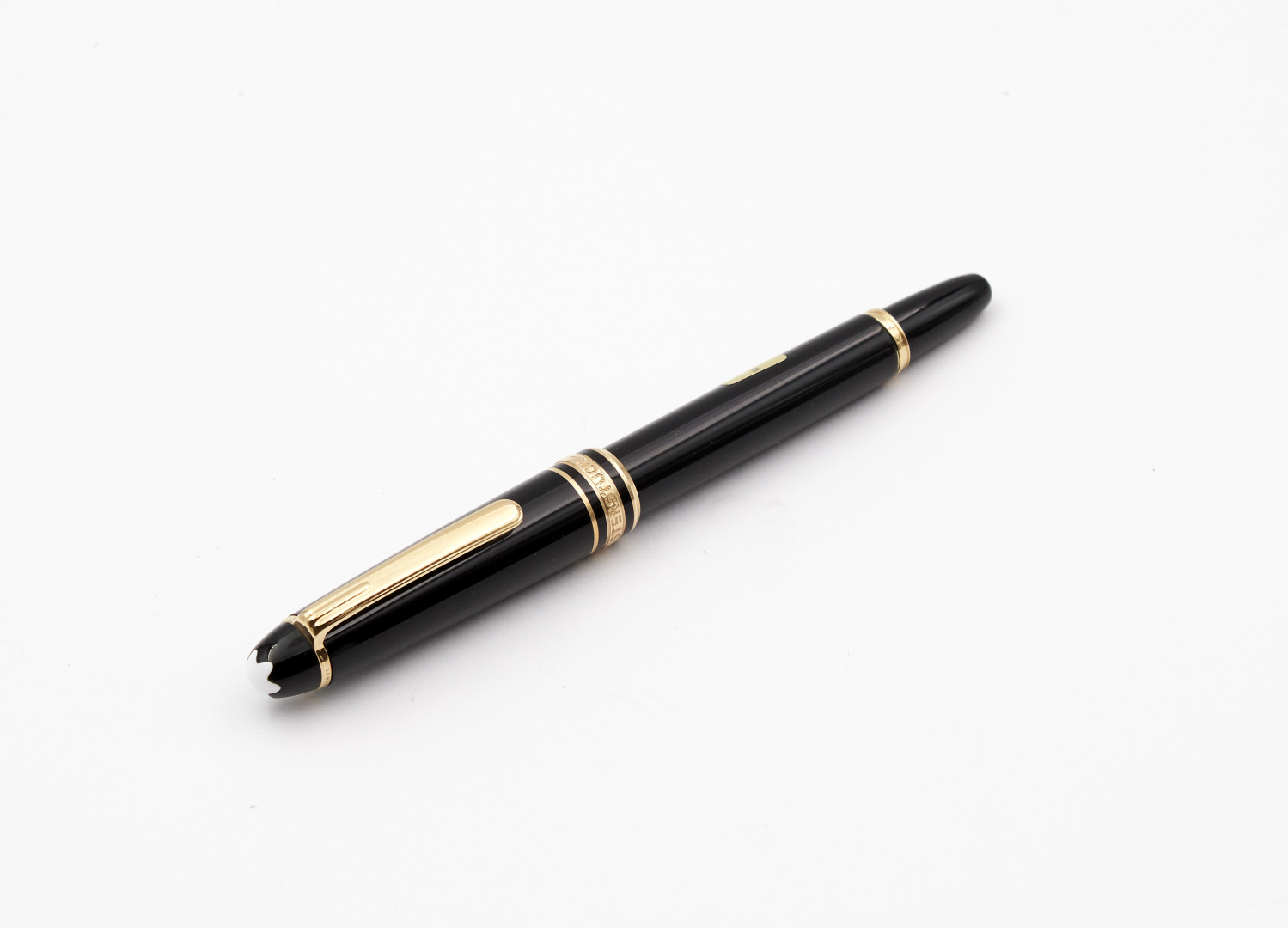 N. CK1019184, signed 14K gold nib, size F, ink cartridges, black with gilt accent.