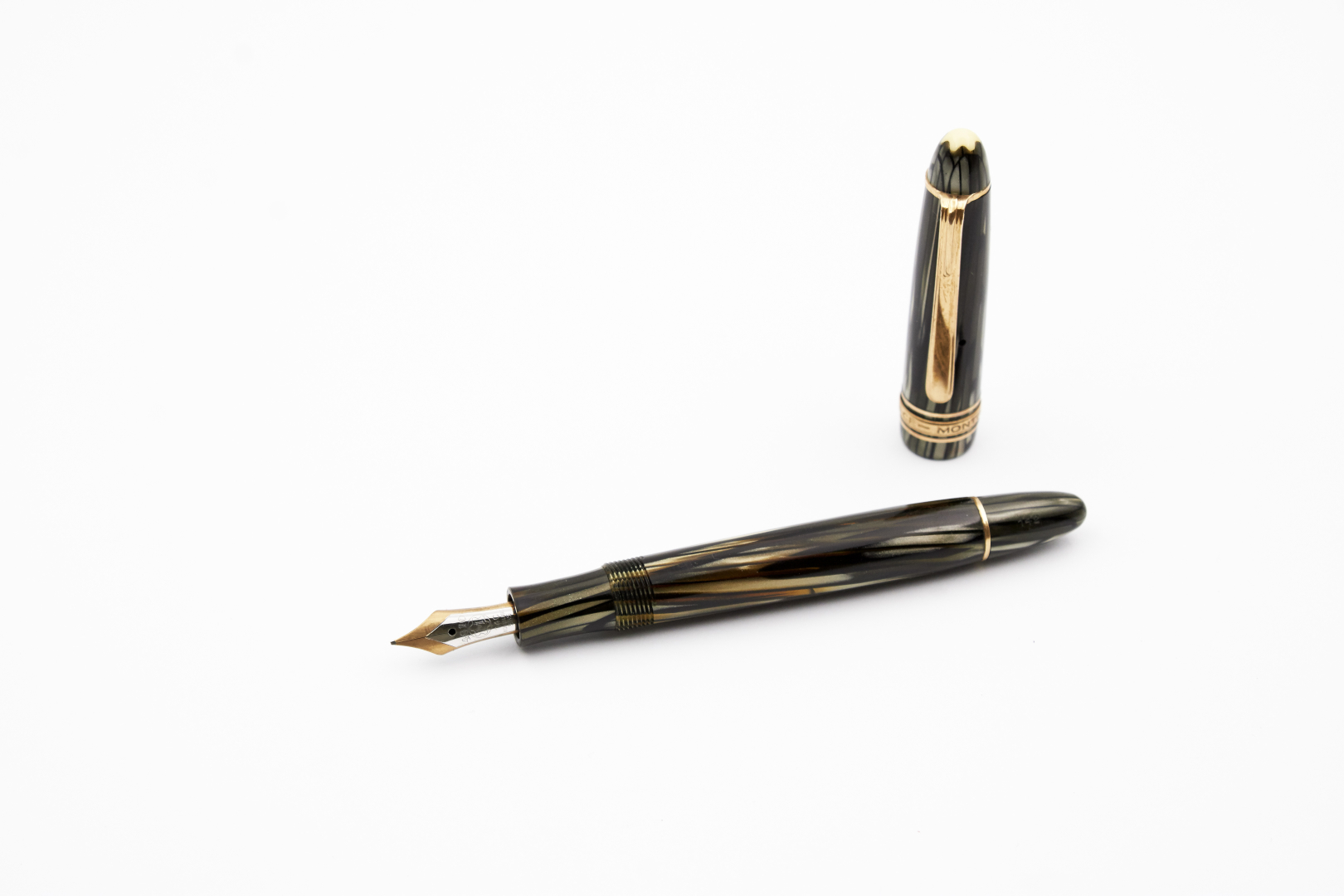 Signed two-tone 14K gold nib, italic cut, piston filler, grey-platinum striped celluloid body with gilt accent.