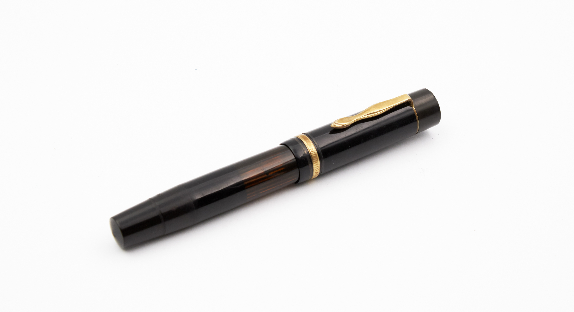 Signed two-tone 14K gold nib, italic cut, piston filling system, black celluloid body with striped translucent ink window.