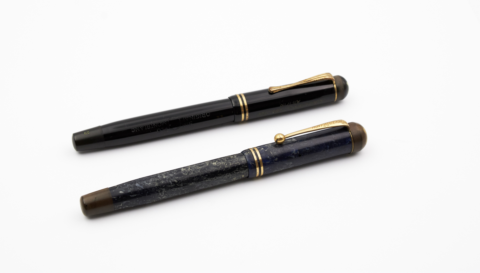 Gold nibs, signed, sizes F and M (latter engraved EF on the cone), piston-filler, bodies in azurite celluloid and black celluloid, respectively.