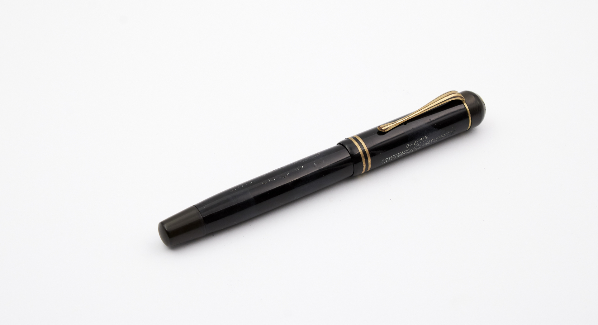 Gold nib, signed, F size, piston-filler, black celluloid body.