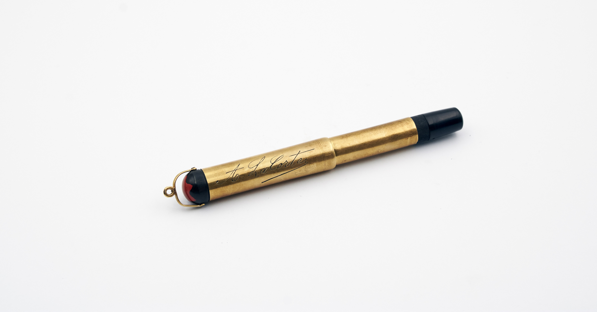Retractable signed gold nib, n. 2, eyedropper-filling, 18K gold overlay on black ebonite body, cone engraved “2M”, cap engraved with name.
