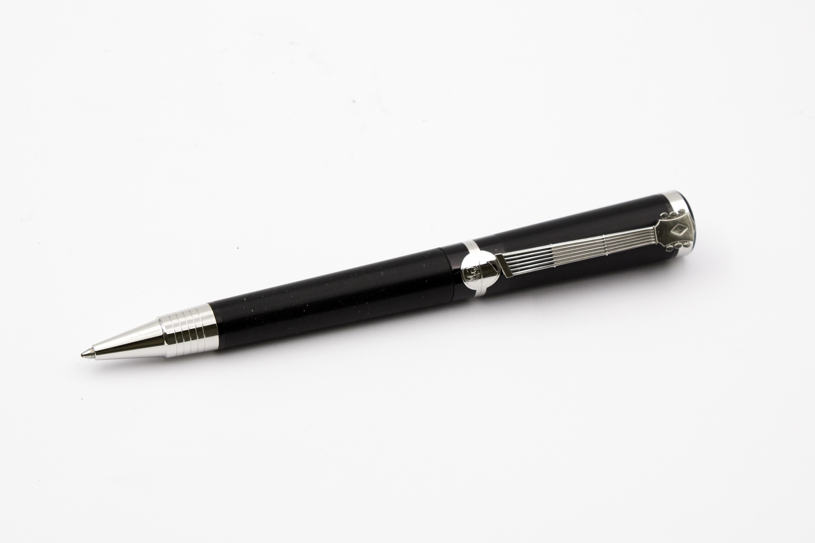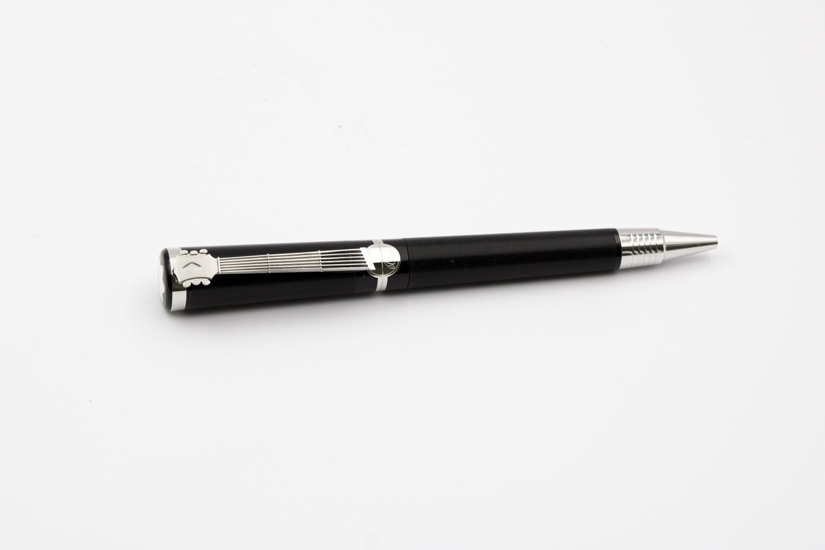 N. PW1625645, engraved black resin, rhodium-plated accents, clip in shape of a guitar fretboard.