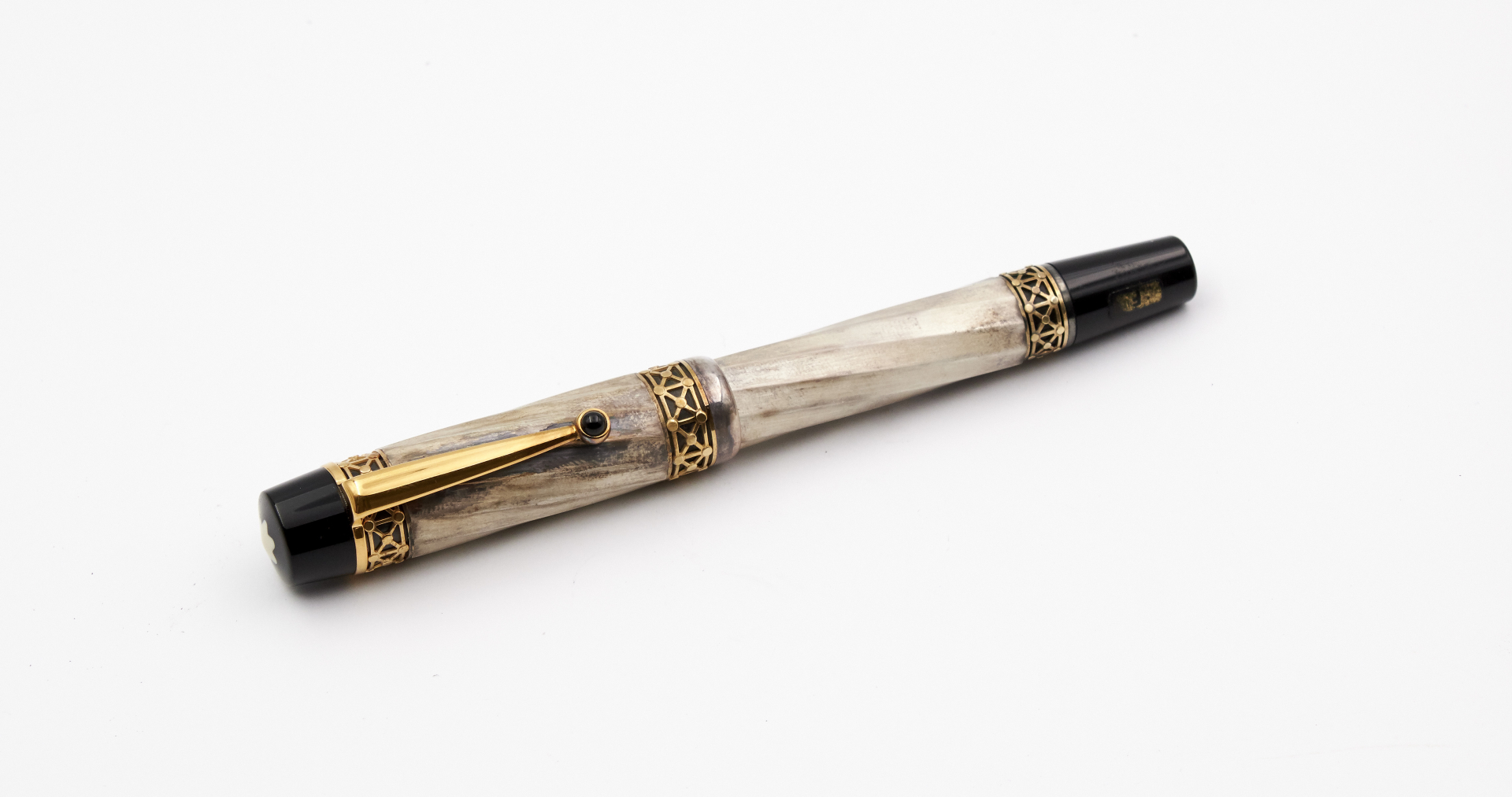 N. 2357/4810, signed two-tone 18K gold nib, size F, piston filler, twisted 925 silver, pierced rings.