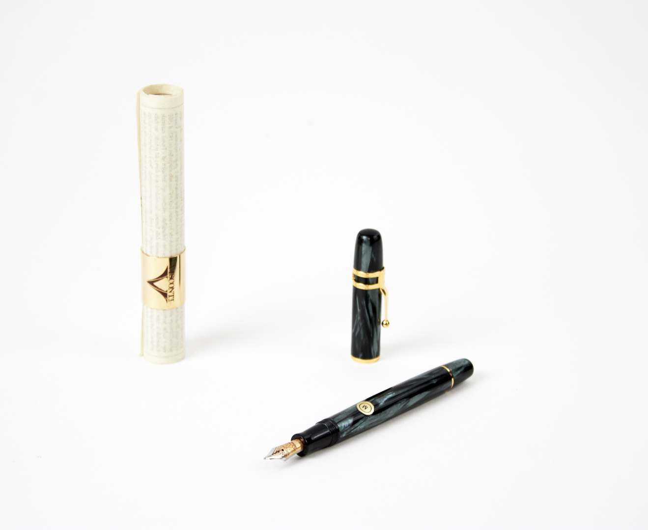Signed two-tone 14K gold nib, screw-down end cap, piston filler, marbled grey-green resin body with gilt accents.