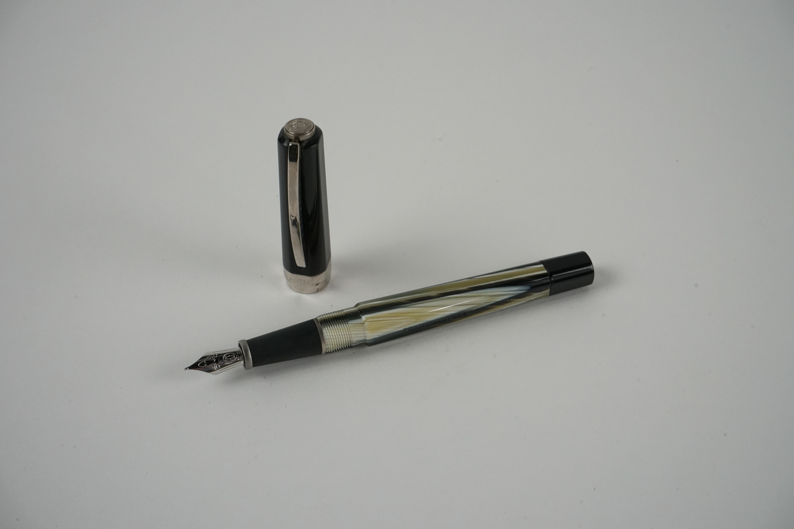 N. 050, signed 18K gold nib, piston filler, black and ivory resin.