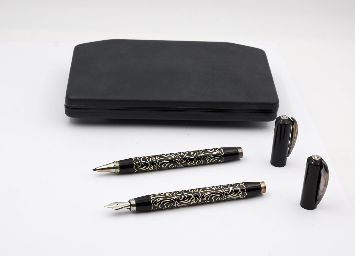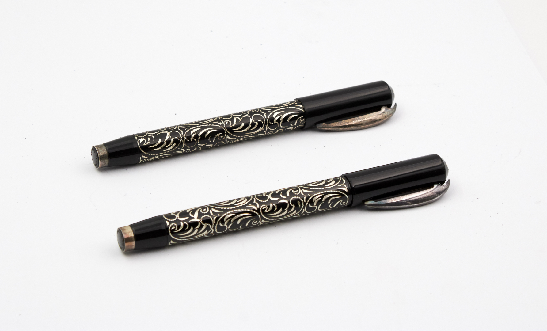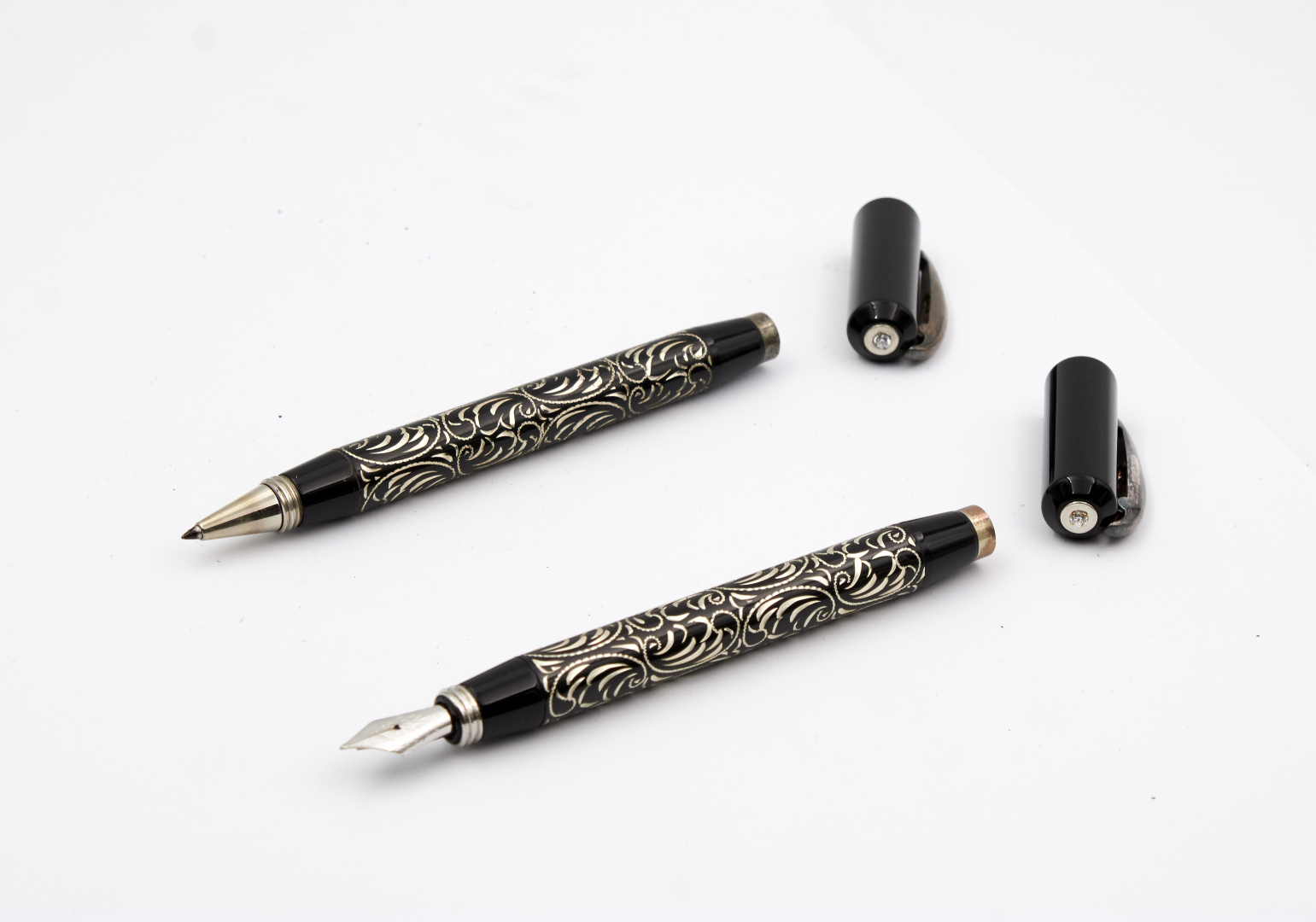 Signed 14K gold nib, F size, piston filling, black lucite, engraved and lacquered silver.
