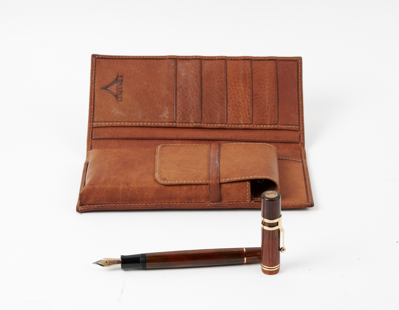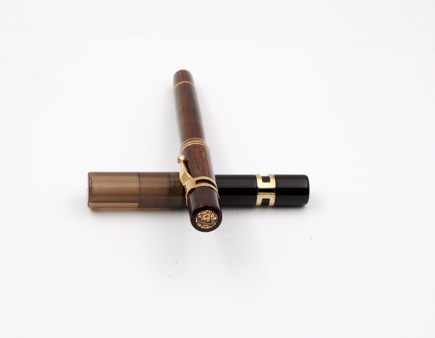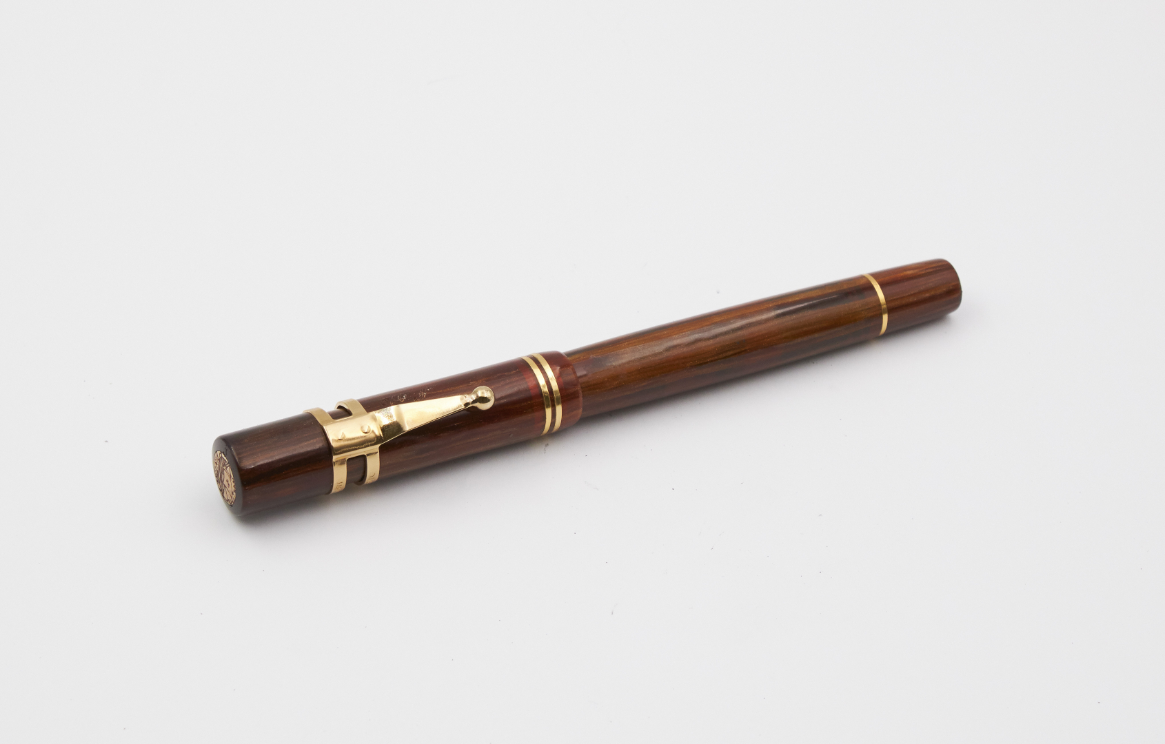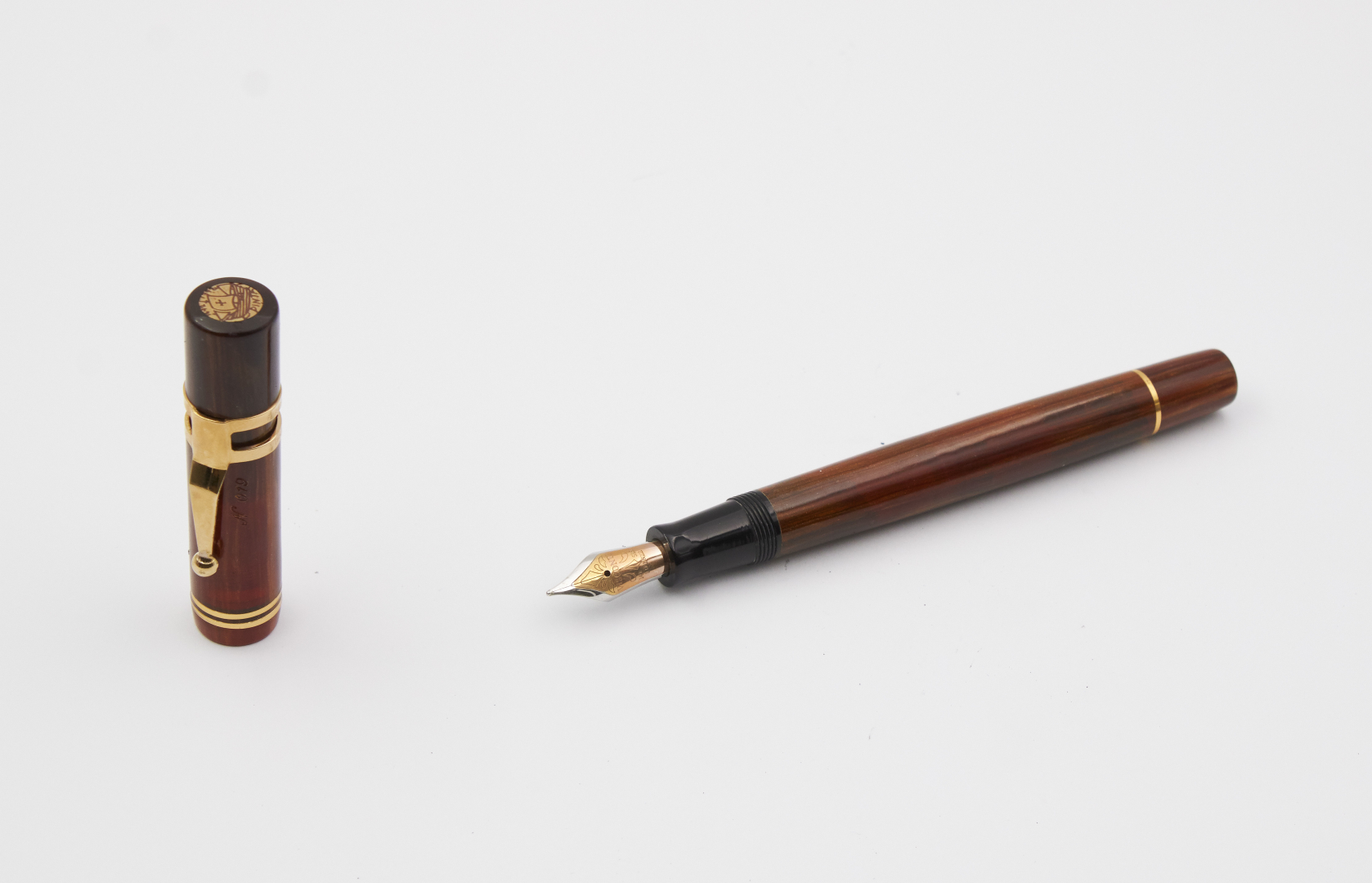 N. 019/500, 14K gold nib, signed, piston filler, body with marbled brown wood effect.
