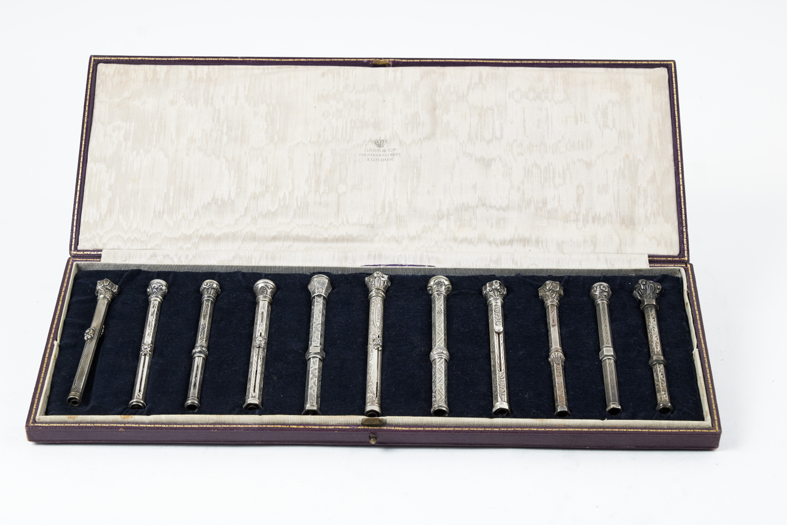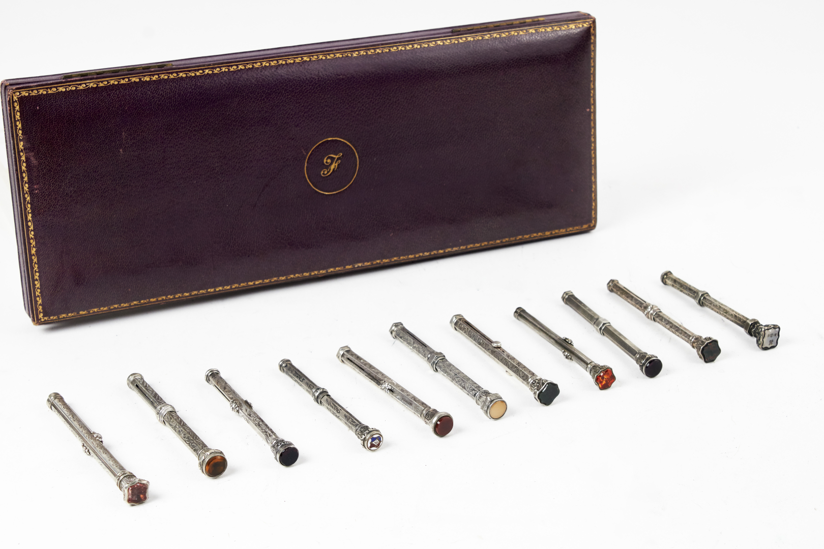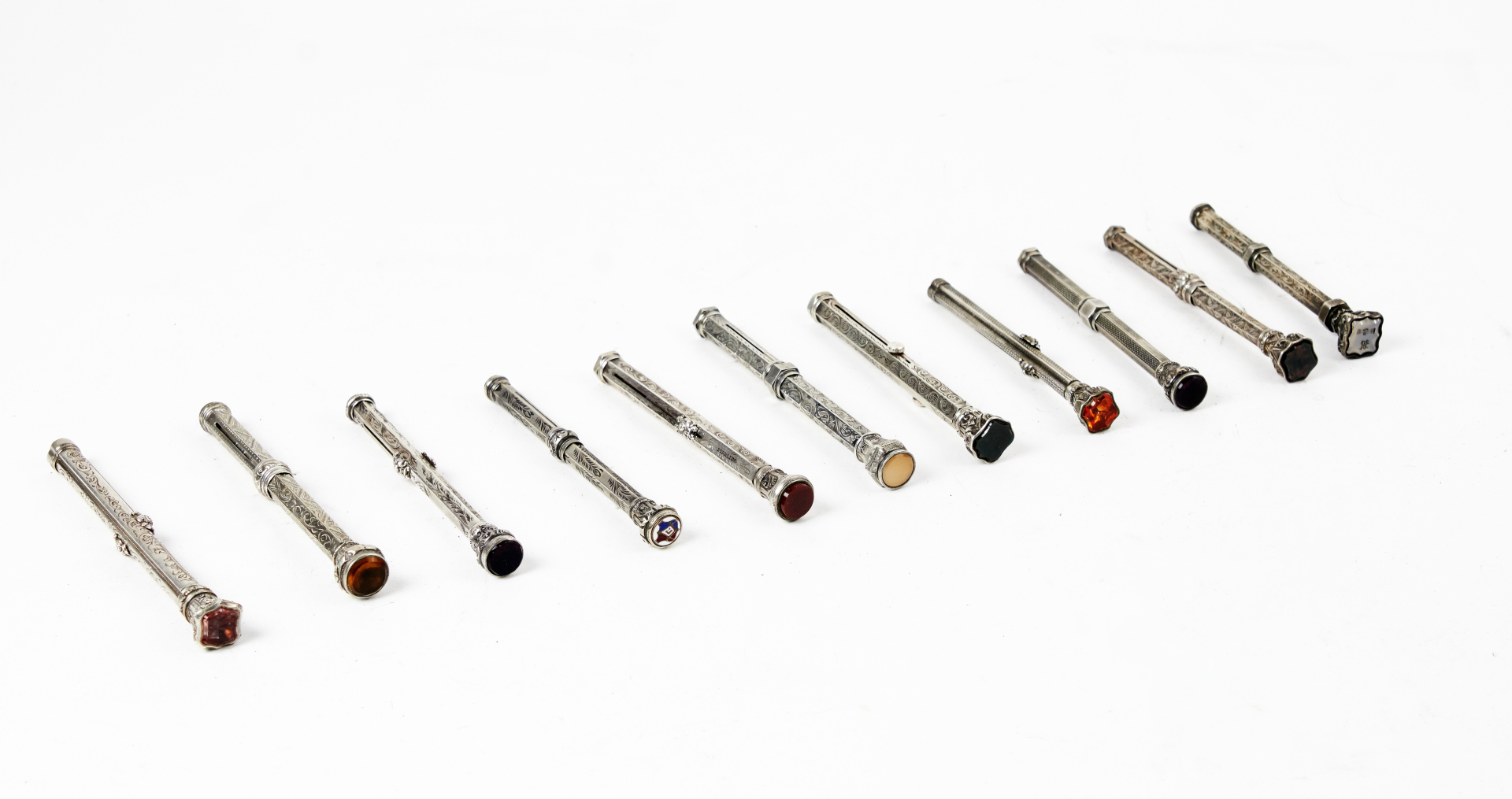 Silver barrels richly decorated, with end pieces in various capital-style designs, adorned with hard stones set at the top. All mechanical pencils, with some examples combining fountain pen and pencil functions.