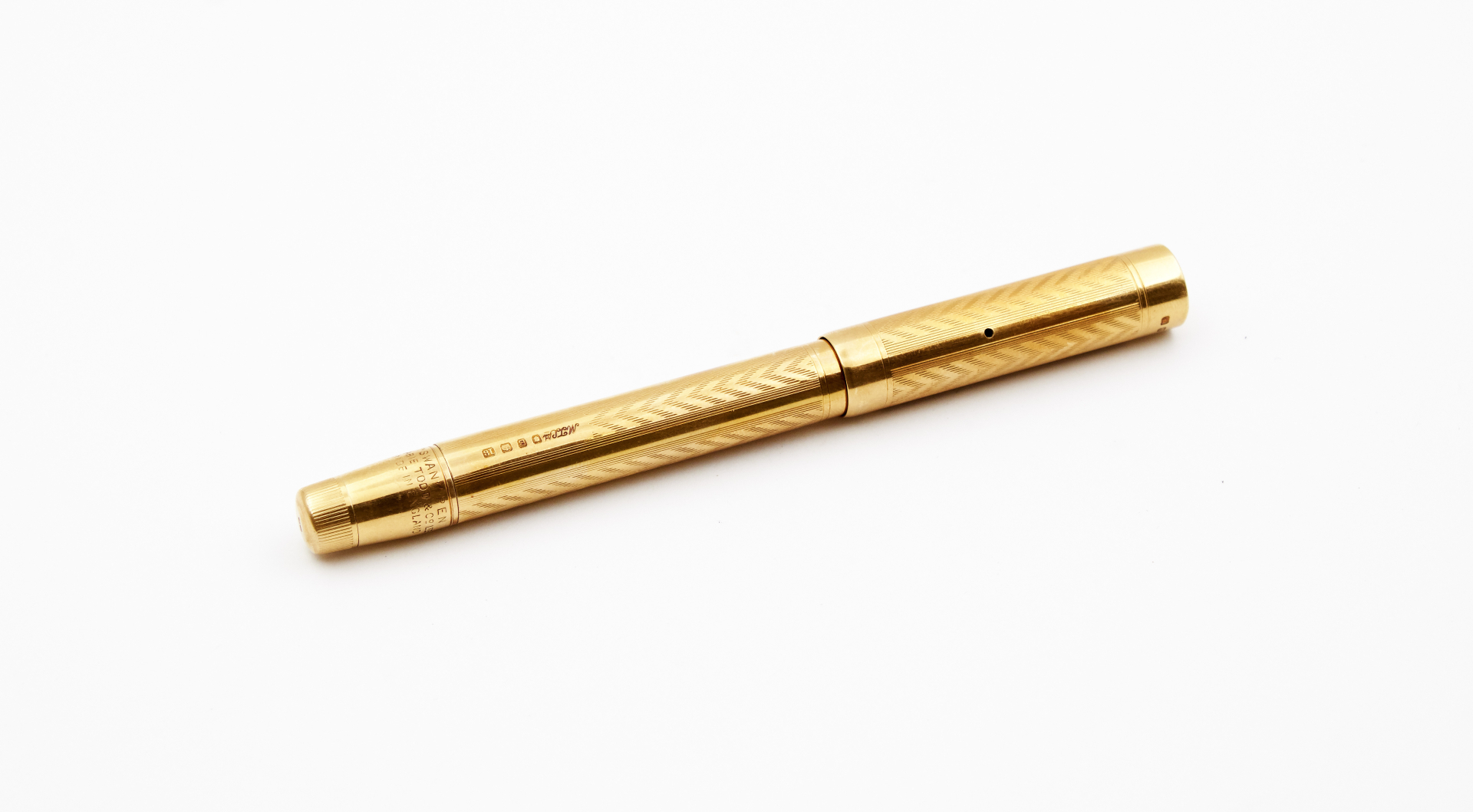 Signed 14K gold nib, n. 2, piston filler, 18K gold body with chevron pattern, English hallmarks, marked "MT Ltd".