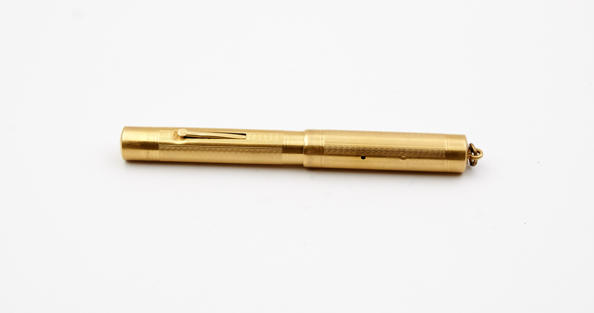 Signed 14K gold nib, n. 2, lever filler, 18K gold body with engine work, English hallmarks, marked "MT Ltd".