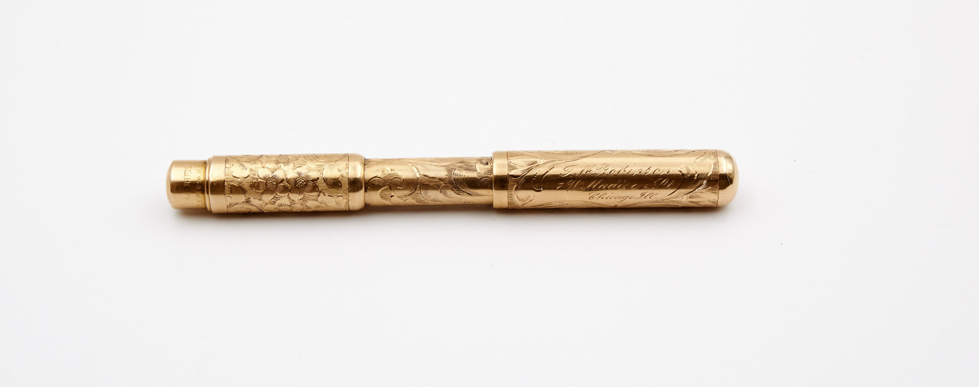 Sliding retractable gold nib, F size, 14K gold body engraved with floral motifs, cap engraved with personalized inscription.