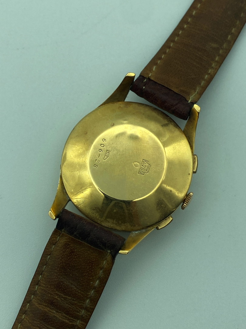 Case: signed, n. 606-28, in 18K gold, snap on caseback, rectangular pushers and lateral correctors.