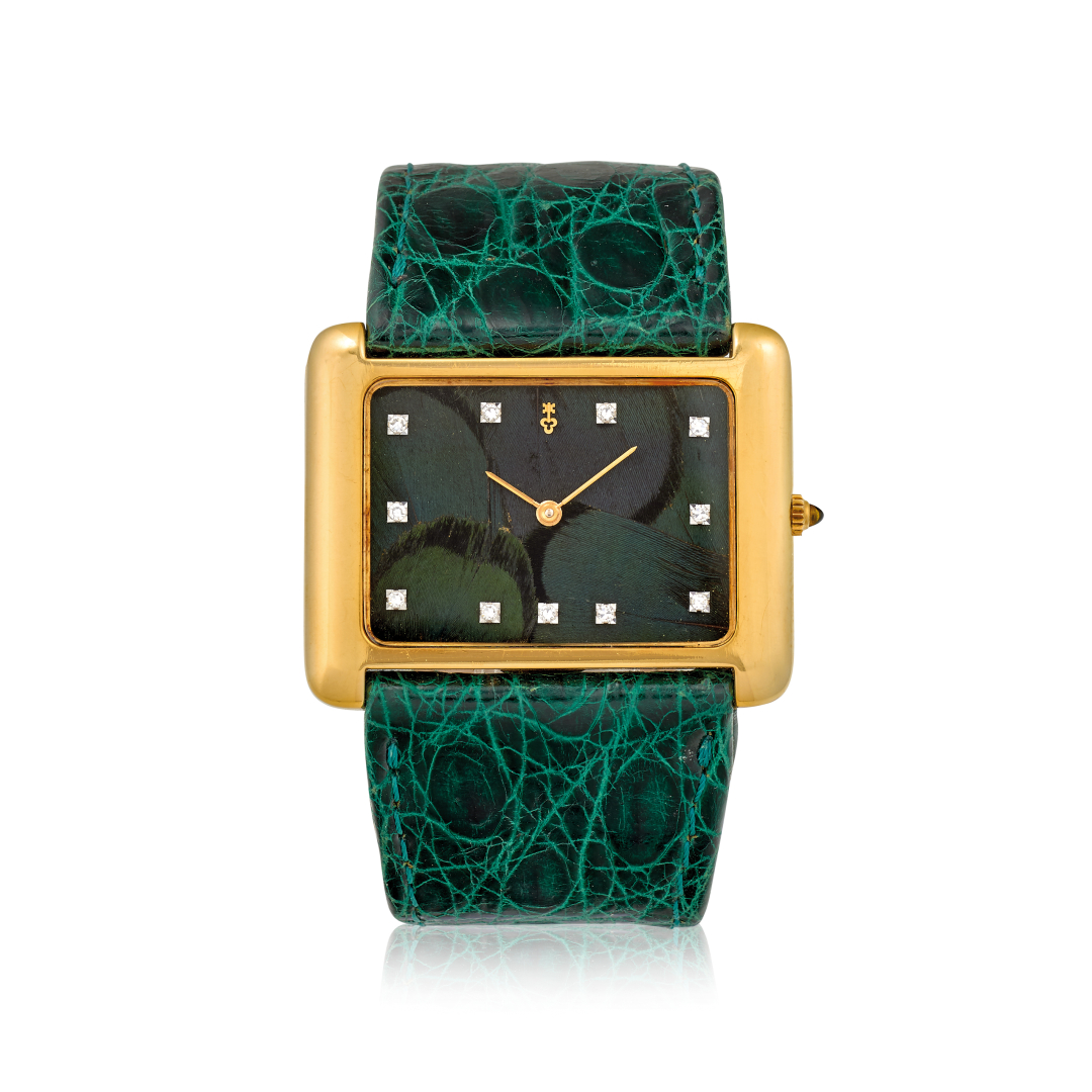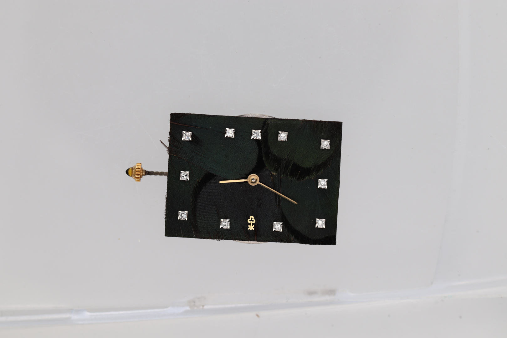 Dial: signed, peacock feathers, indexes sets with diamonds.