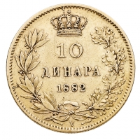 Milan Obrenovich IV (1868-1889) - 10 Dinari 1882 - Zecca: Vienna - Diritto: effigie del Re a destra - Rovescio: valore e data sormontati da una corona entro due rami di alloro e di quercia annodati alla base