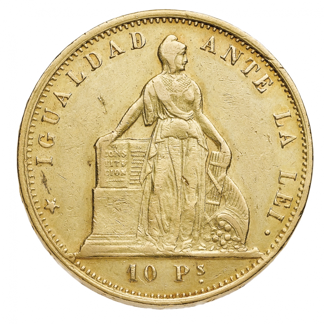 Repubblica (dal 1918) - 10 Pesos 1858 - Zecca: Santiago del Cile - Diritto: Libertà stante a destra con simboli allegorici - Rovescio: stemma sorretto da cervo e aquila entrambi coronati - Ultima cifra della data 8 ribattuta su 7