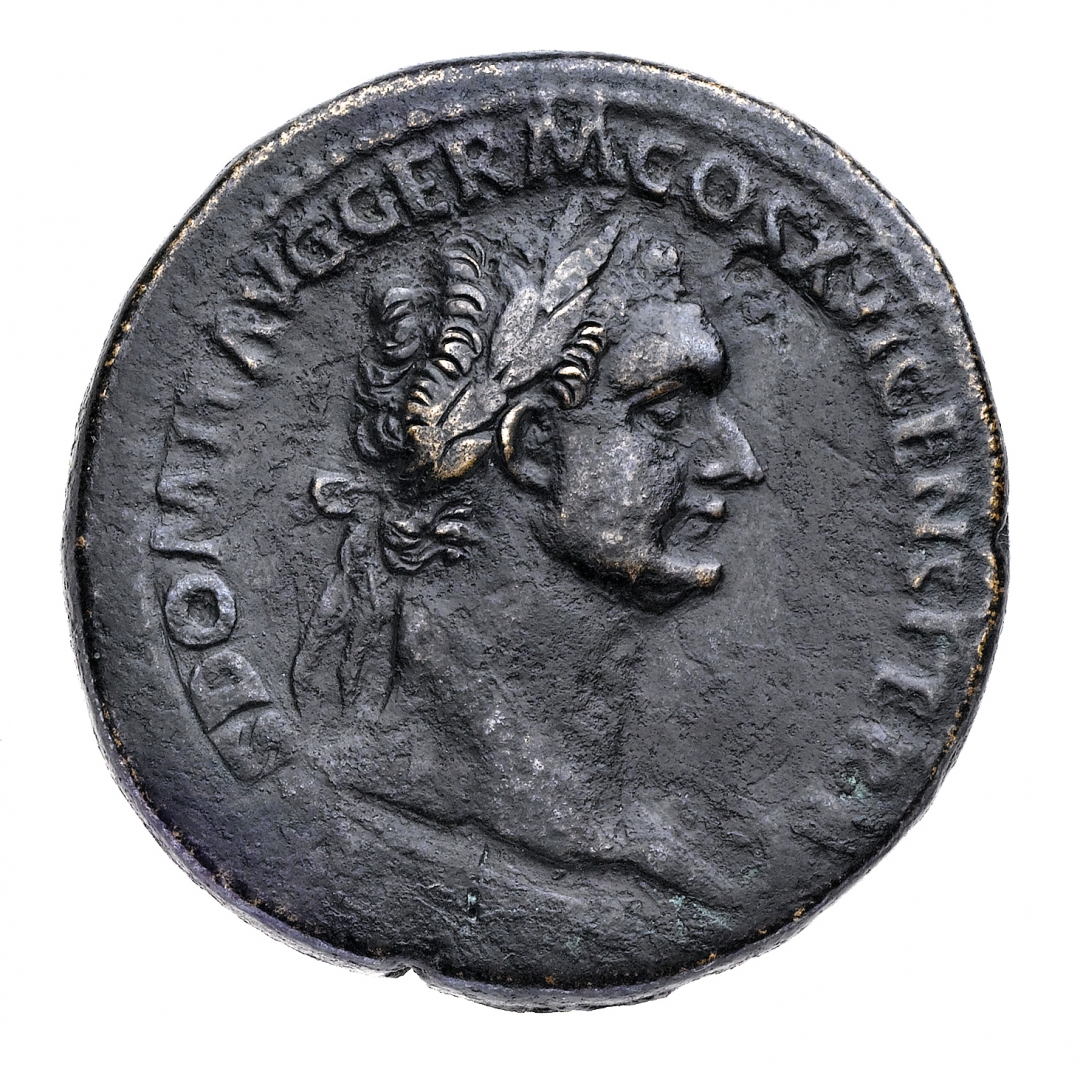 Sesterzio databile agli anni 92-94 d.C. - Zecca: Roma - Diritto: testa laureata dell'Imperatore a destra - Rovescio: Giove seduto a sinistra tiene una piccola Vittoria con la mano destra e uno scettro con la sinistra - gr. 29,01 - Rovescio lievemente ritoccato