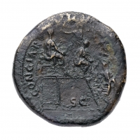 Sesterzio databile al 96 d.C. - Zecca: Roma - Diritto: testa laureata dell'Imperatore a destra - Rovescio: Nerva seduto a destra su una piattaforma, di fronte un ufficiale nell'atto di distribuire doni a un cittadino; sullo sfondo le statue di Minerva e della Liberalitas - gr. 21,36 - Rara