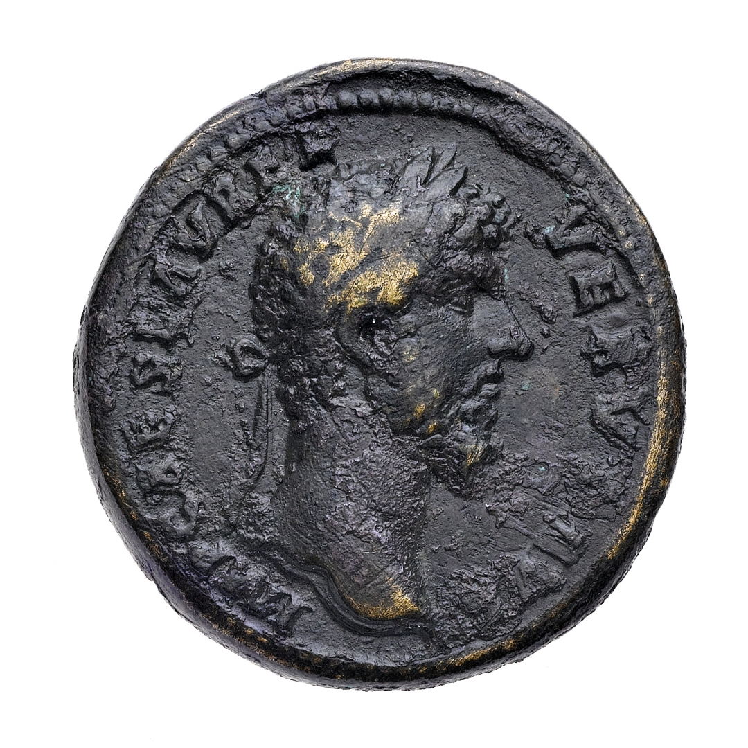 Sesterzio databile al 161 d.C. - Zecca: Roma - Diritto: testa dell'imperatore a destra - Rovescio: Lucio Vero su cavallo al galoppo verso destra tiene una lancia con la mano destra; di fronte un soldato, dietro tre soldati - gr. 23,86
