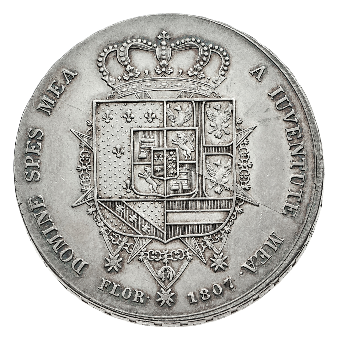 Carlo Ludovico di Borbone (1803-1807) - Dena (10 Lire) 1807 - Zecca: Firenze - Diritto: busti accolllati del Re e della madre reggente, Maria Luigia di Spagna, a destra - Rovescio: stemma coronato sovrapposto alla Croce di Santo Stefano e circondato dal Collare del Toson d'Oro - gr. 39,35 - Lieve difetto di conio al rovescio, ma con patina di medagliere, SPL