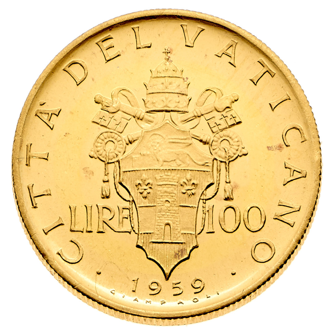 Giovanni XXIII (1958-1963) - 100 Lire 1959 - Zecca: Roma - Diritto: busto del Papa a destra - Rovescio: stemma sovrapposto alle chiavi decussate e sormontato dalla tiara - gr. 5,20 - Praticamente FDC - In lotto con serie divisionale
