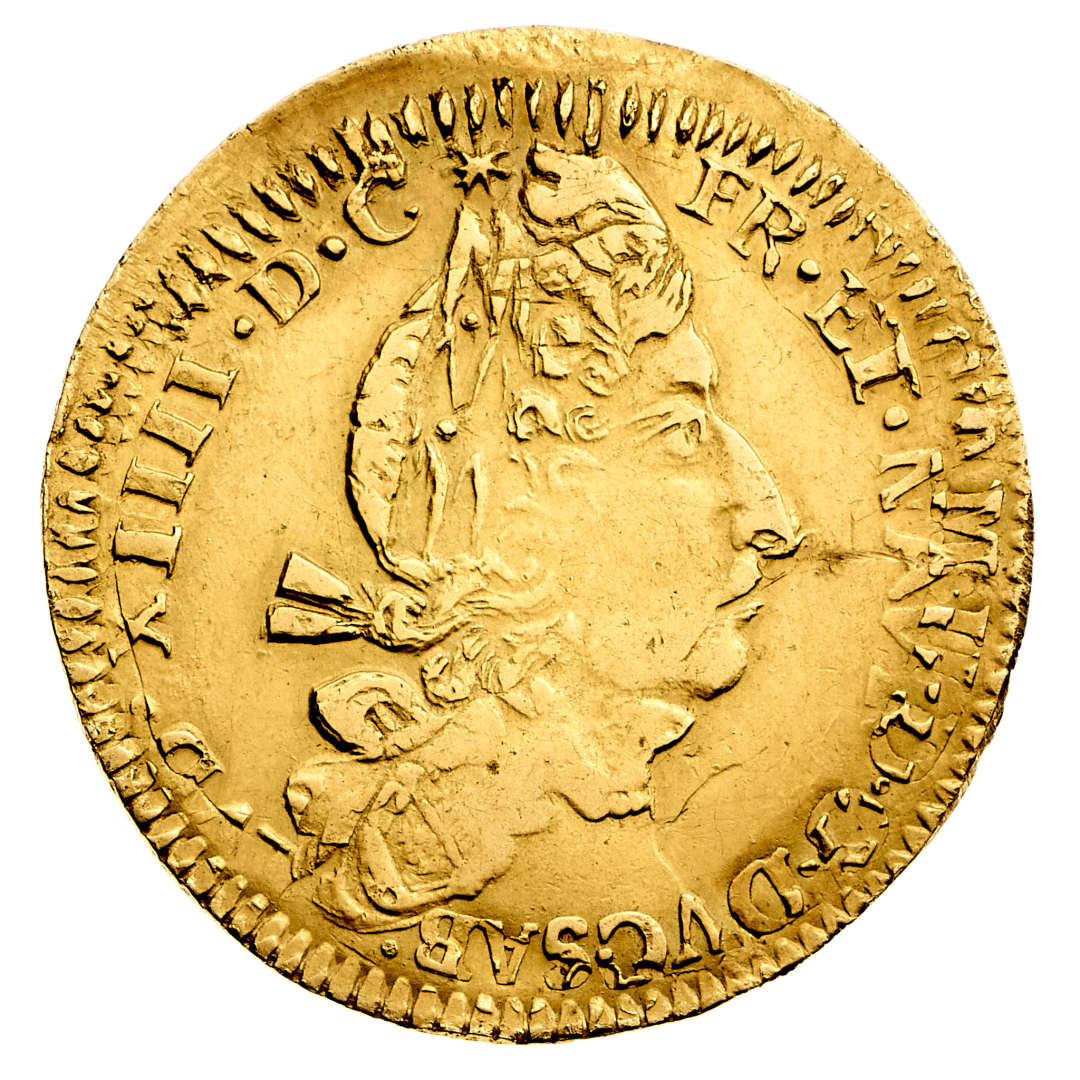 Louis XIV (1643-1715) - Louis d'or "aux 4 L" (16??) - Zecca: Tours - Diritto: testa laureata del Re a destra - Rovescio: quattro L disposte a croce, separate da quattro gigli - gr. 6,62 - Molto rara - q.SPL - Riconiata su una Doppia di Vittorio Amedeo II durante il periodo della reggenza