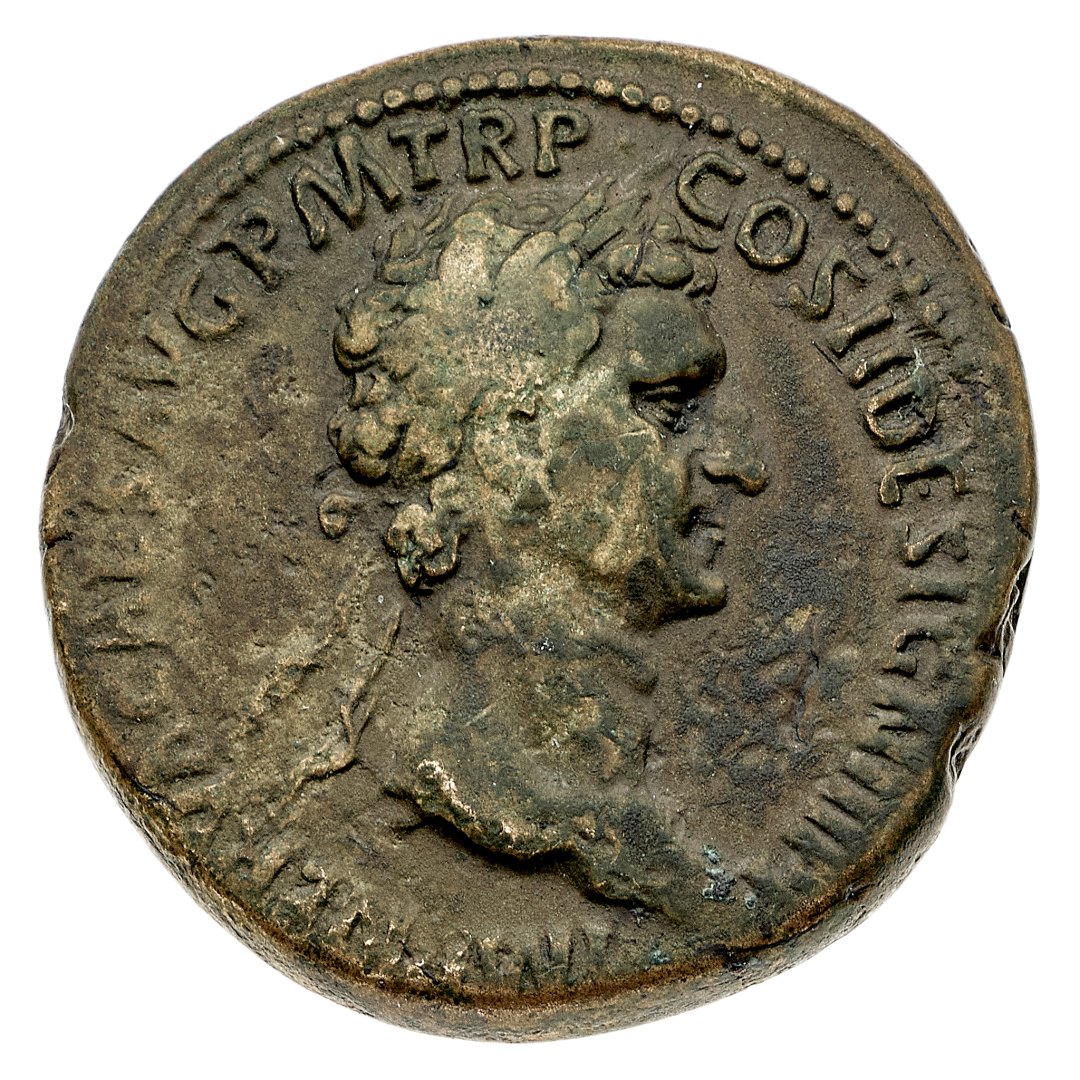 Sesterzio databile al 96 d.C. - Zecca: Roma - Diritto: testa laureata dell'Imperatore a destra - Rovescio: la Libertas stante tiene un pileo con la mano destra e uno scettro con la sinistra - gr. 24,87 - BB