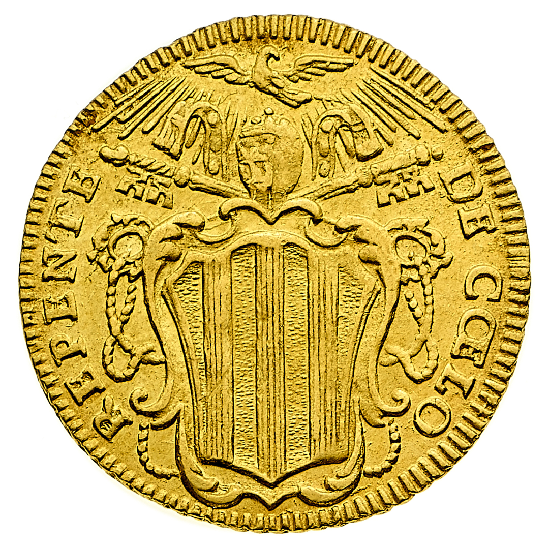 Benedetto XIV (1740-1758) - Zecchino 1746 - Zecca: Roma - Diritto: la Chiesa seduta sulle nubi tiene le chiavi di San Pietro nella mano destra e un tempietto nella sinistra - Rovescio: stemma sormontato dalle chiavi decussate, dalla tiara e dalla colomba dello Spirito Santo - gr. 3,40 - SPL