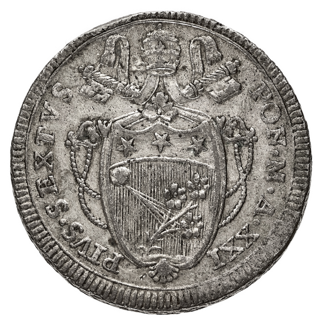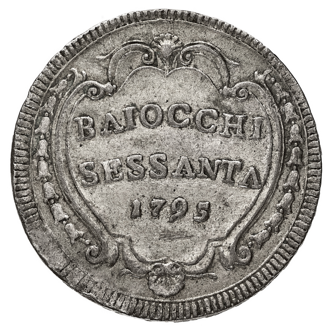 Pio VI (1775-1799) - 60 Baiocchi 1795 Anno XXI - Zecca: Roma - Diritto: stemma sormontato dalle chiavi decussate e dalla tiara - Rovescio: valore e data su tre righe - gr. 22,24 - Rara - BB