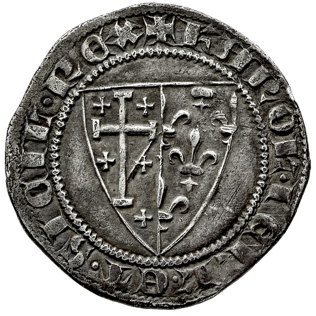 Carlo I d'Angiò (1266-1285) - Saluto d'argento - Zecca: Napoli - Diritto: stemma bipartito di Francia e Gerusalemme sormontato da un crescente di luna e circondato da stelle e rosette alternate - Rovescio: l'Annunciazione della Vergine; interposta, una pianta di giglio - gr. 3,18 - q.BB