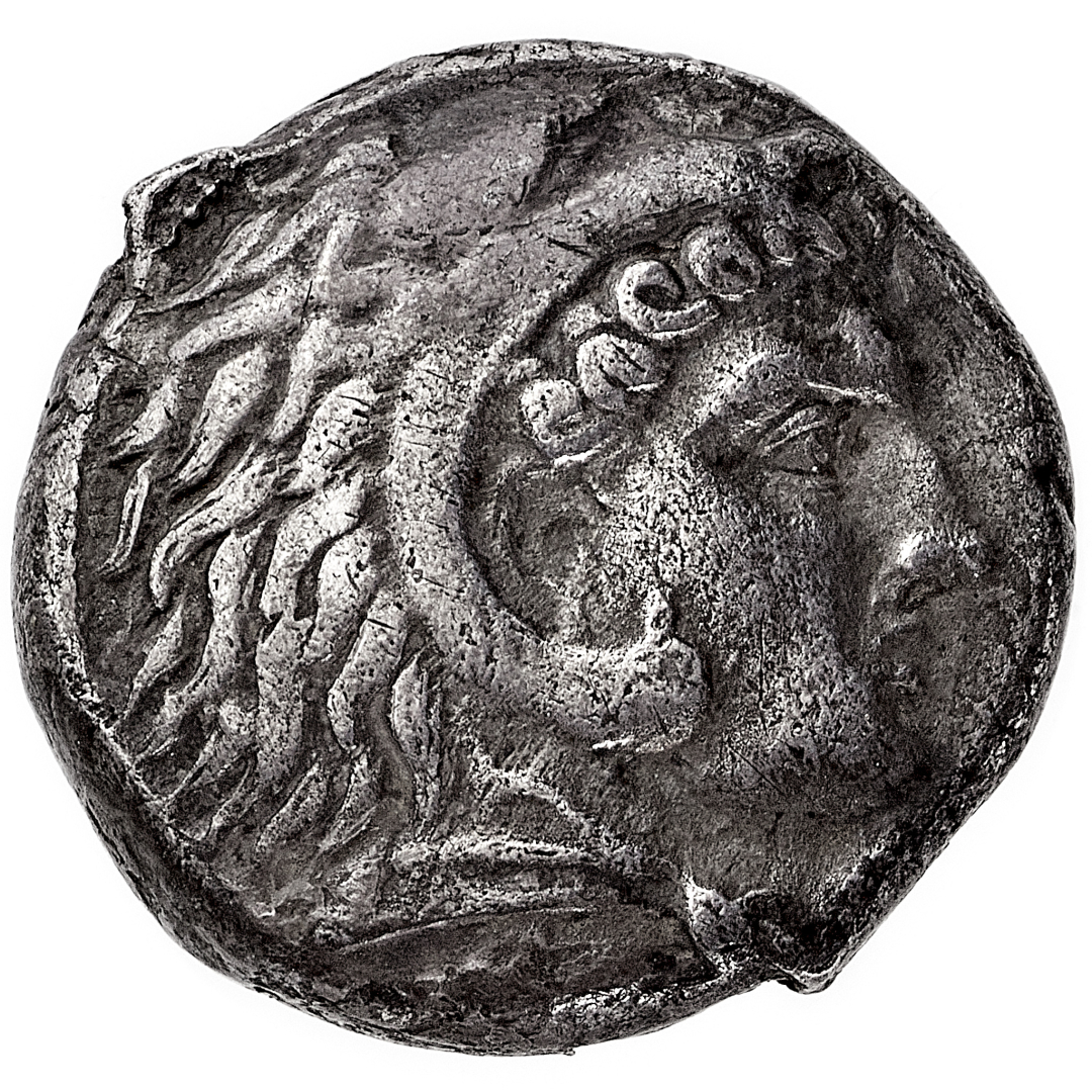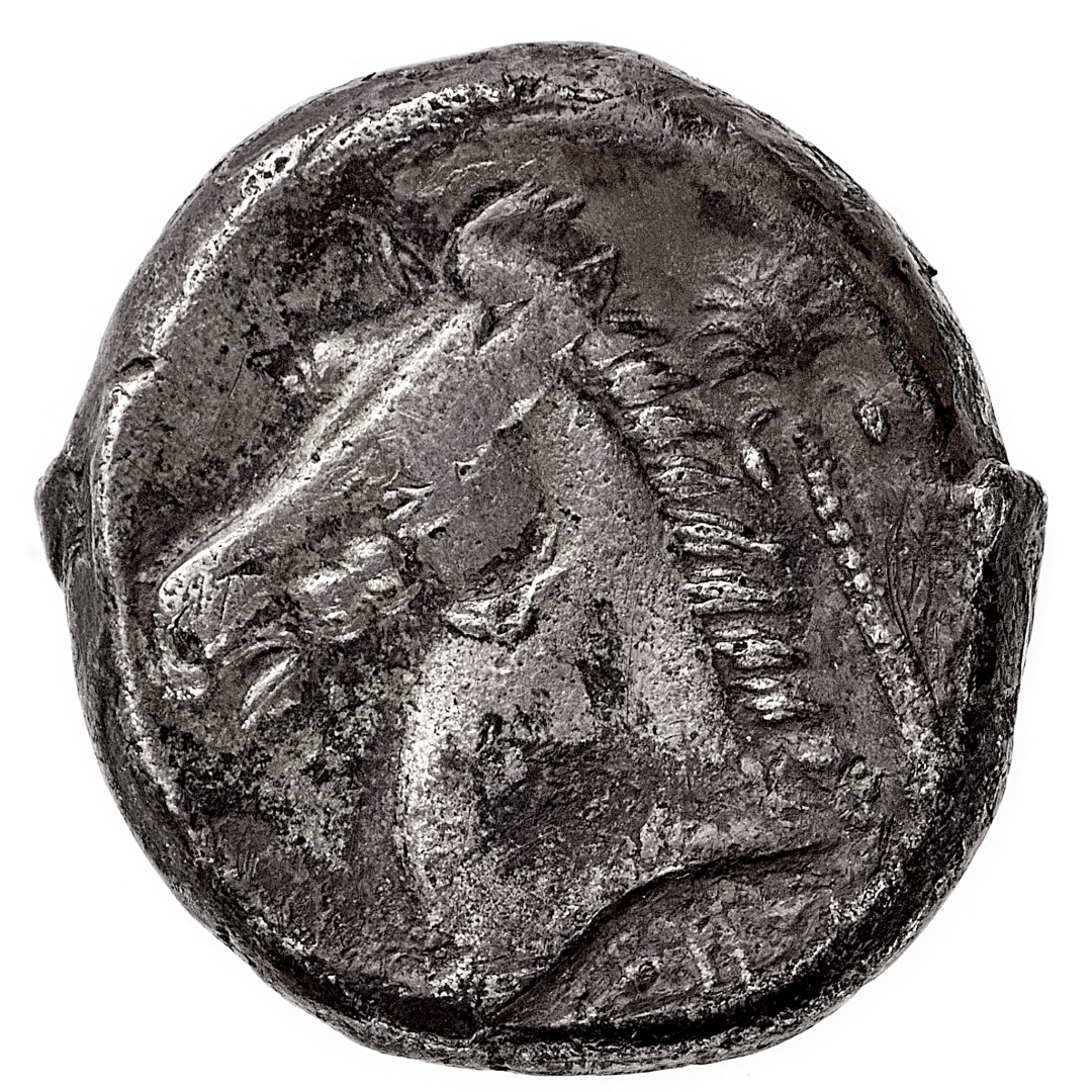 Dominazione punica - Tetradramma databile al periodo 300-289 a.C. - Zecca: Entella - Diritto: testa di Eracle a destra ricoperta dalle fauci del leone - Rovescio: protome equina a sinistra e palmizio - gr. 17,04 - Rara - BB