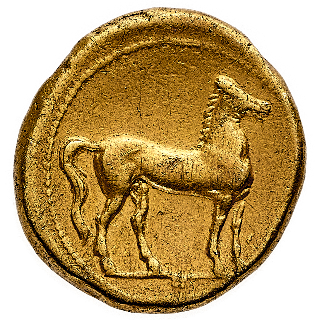 Cartagine - Statere in elettro databile al periodo 310-270 a.C. - Diritto: testa di Persefone a sinistra con la capigliatura raccolta e fermata da una corona di spighe e con collier di pendenti - Rovescio: cavallo stante a destra - gr. 7,40 - BB