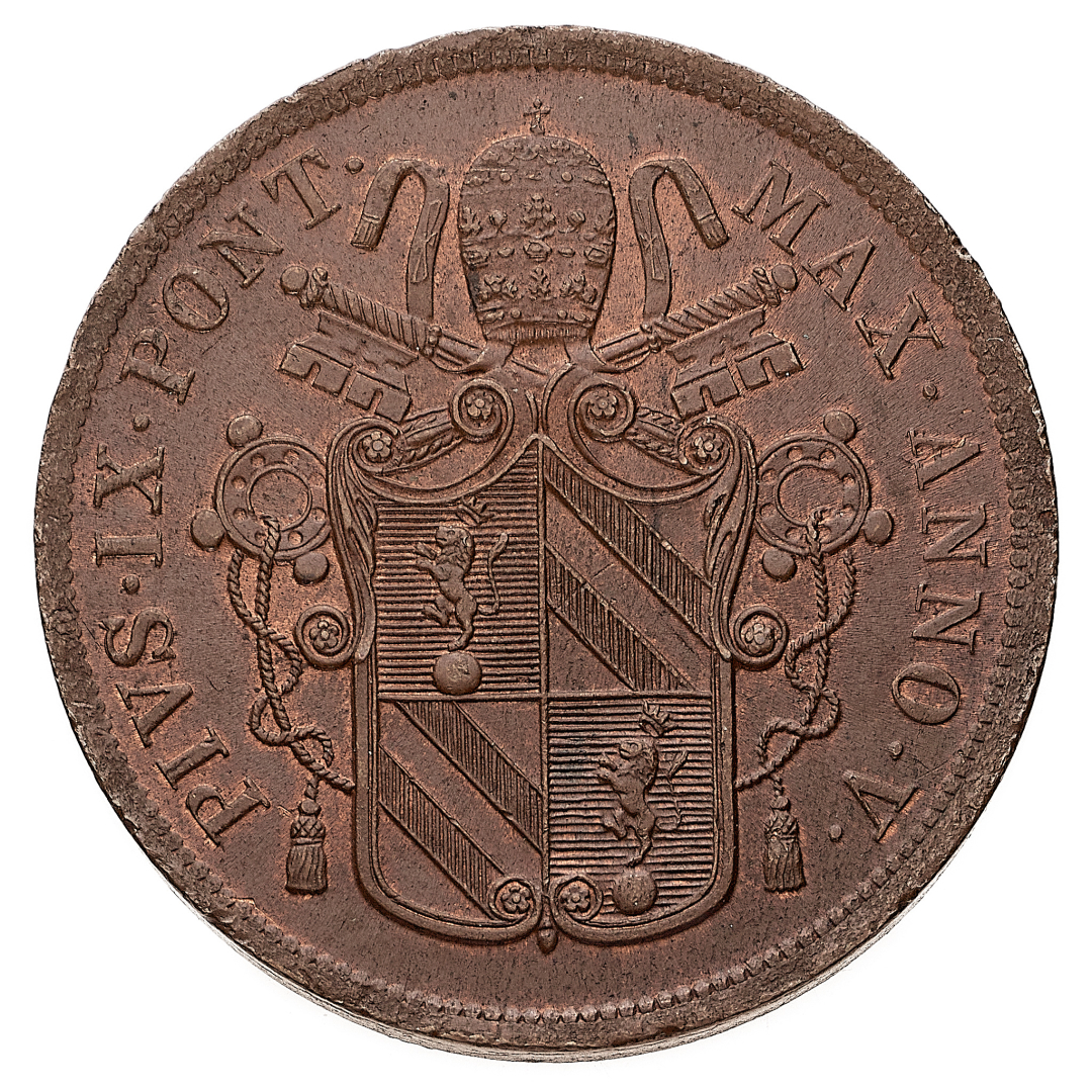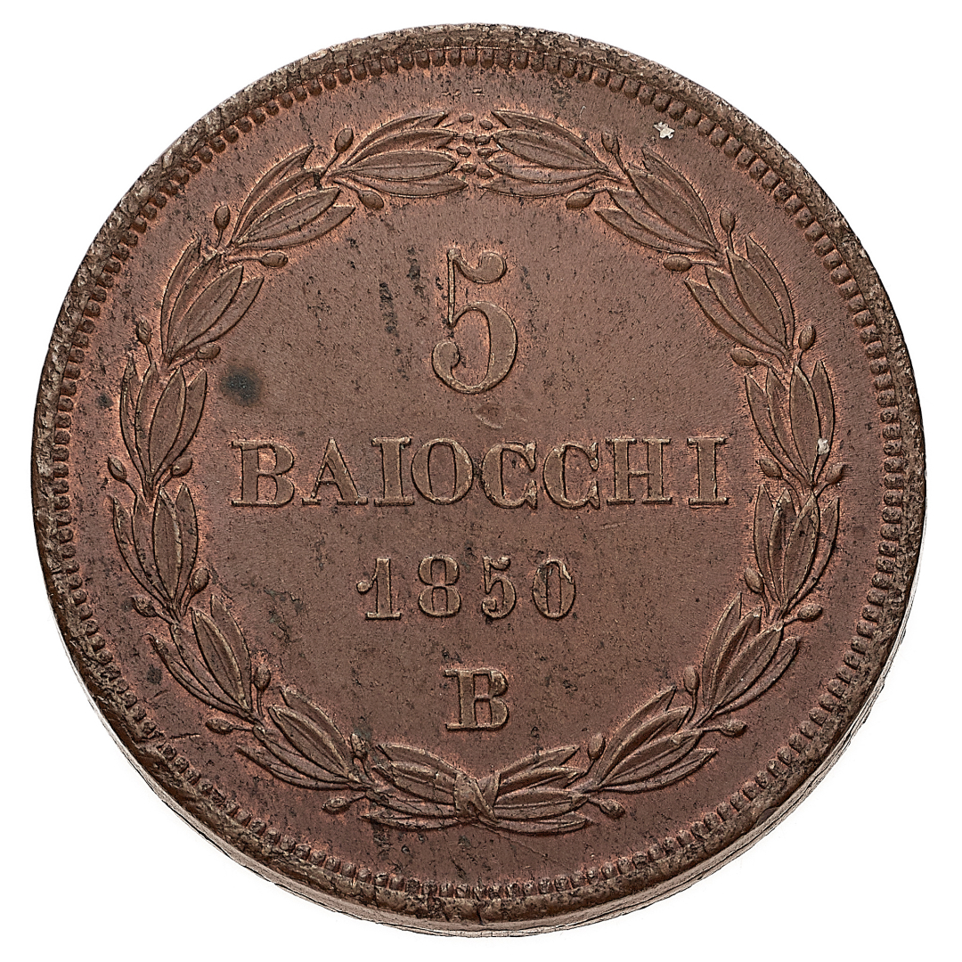 Pio IX (1846-1870) - 5 Baiocchi 1850 Anno V - Zecca: Bologna - Diritto: stemma sormontato dalle chiavi decussate e dalla tiara - Rovescio: valore e data su tre righe entro corona d'alloro - gr. 40,60 - Riflessi di rame rosso, migliore di SPL