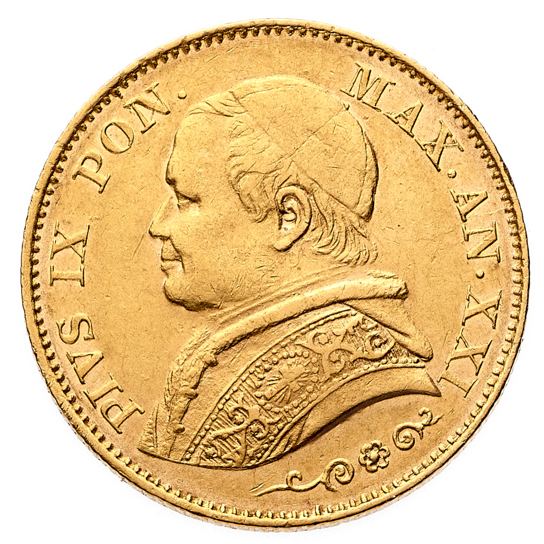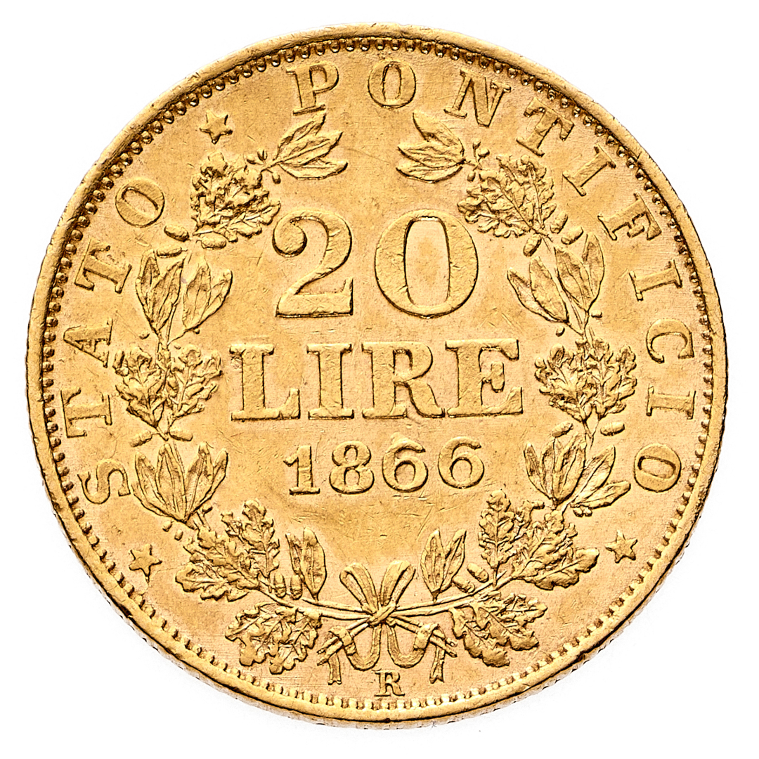 Pio IX (1846-1870) - 20 Lire 1866 Anno XXI - Zecca: Roma - Diritto: effigie del Papa a sinistra - Rovescio: valore e data entro due rami di alloro e di quercia - gr. 6,45 - q.SPL