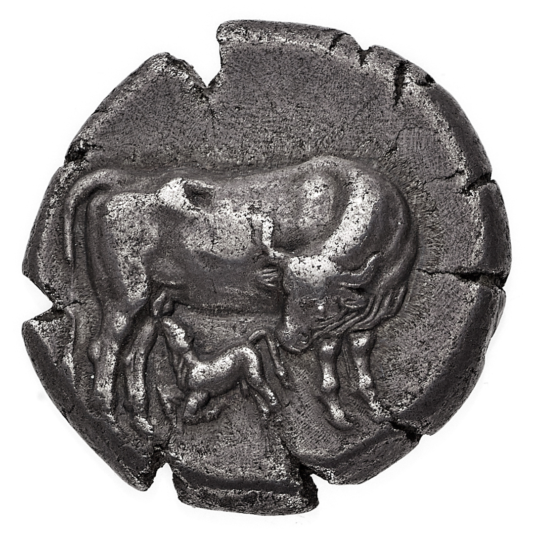 Dyrrachion - Statere databile al periodo 340-280 a.C. - Diritto: giumenta che allatta un vitello - Rovescio: ornamento floreale entro un quadrato con legenda; sotto una clava - gr. 10,61 - Patina di medagliere, q.SPL - Proveniente dall'asta Astarte S.A. XII-XIII, Lugano 12-13.9.2003, n. 152
