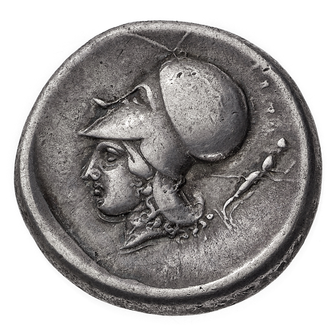 Corinto - Statere databile al 300 a.C. - Diritto: Pegaso in volo verso destra - Rovescio: testa elmata di Atena a sinistra ornata da una corona di alloro; nel campo a destra una statua di Zeus - gr. 8,45 - Migliore di BB